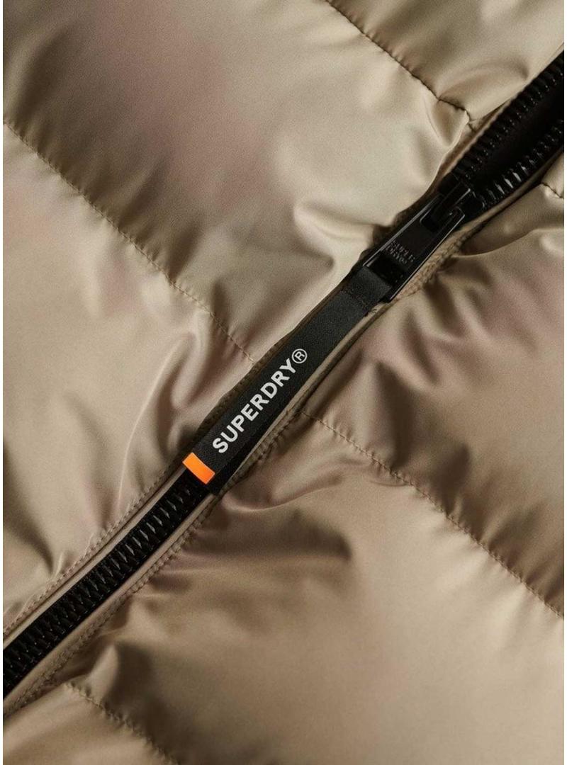 Jaqueta acolchoada Superdry. Modelo Hooded Sports Puffer. Cor bege. Capuz ajustável. Fecho de correr. Bolsos com fecho de correr. Repelente à água. Acabamentos elásticos. Bordado da marca no braço.