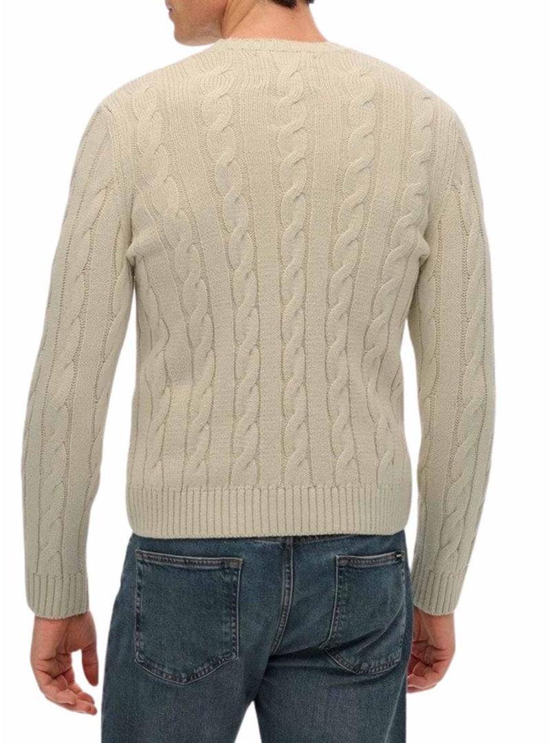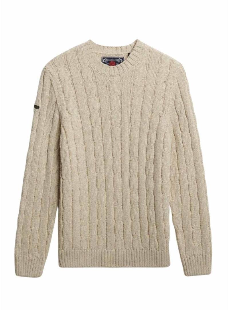 Camisola Superdry. Modelo Jacob Cable. Cor bege. Gola redonda. Ponto de cabo. Detalhes canelados. Emblema de metal da marca. Feito de acrílico e lã. Corte regular.