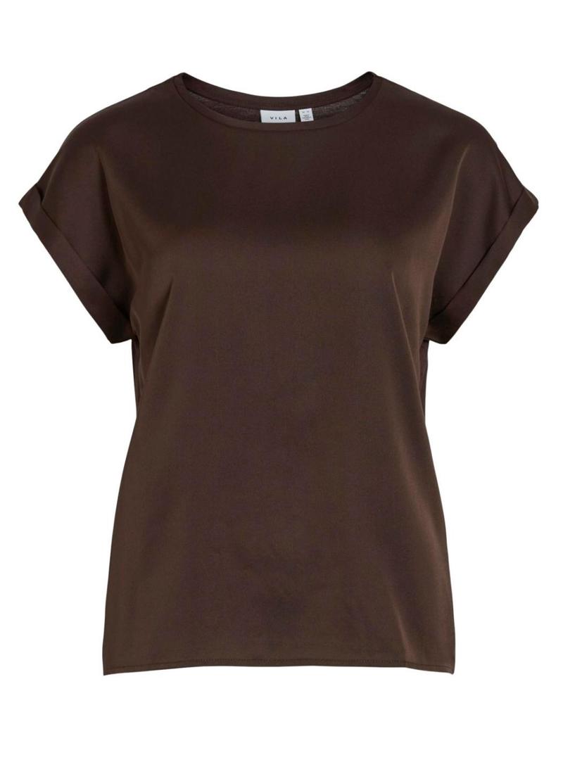 Top de cetim da Vila. Modelo Viellette. Cor marrom. Gola redonda. Manga curta. Tecido fluido e leve.