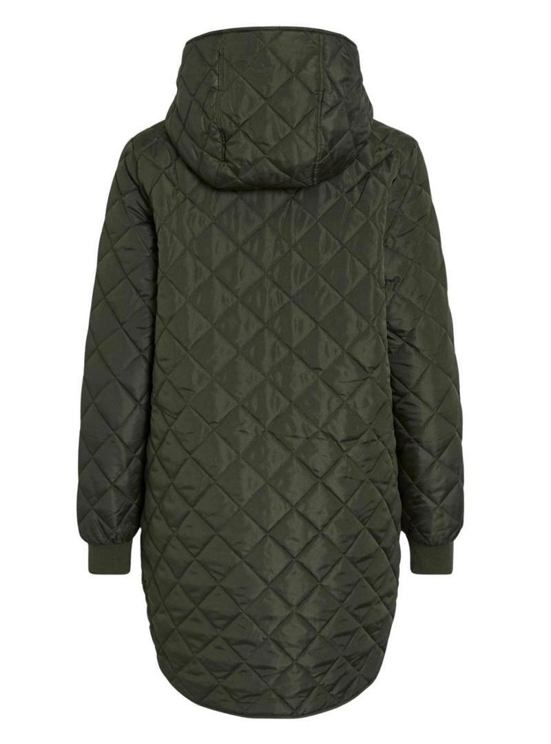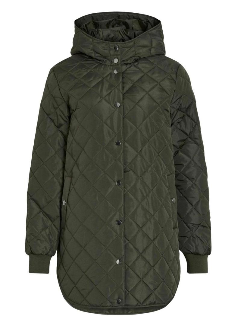 Casaco acolchoado da Vila. Modelo Vitate. Cor verde. Com capuz. Fechamento com botões de pressão. Corte regular. Bolsos frontais com botão. Desenho de losangos. Ligeiramente mais comprido na parte de trás.