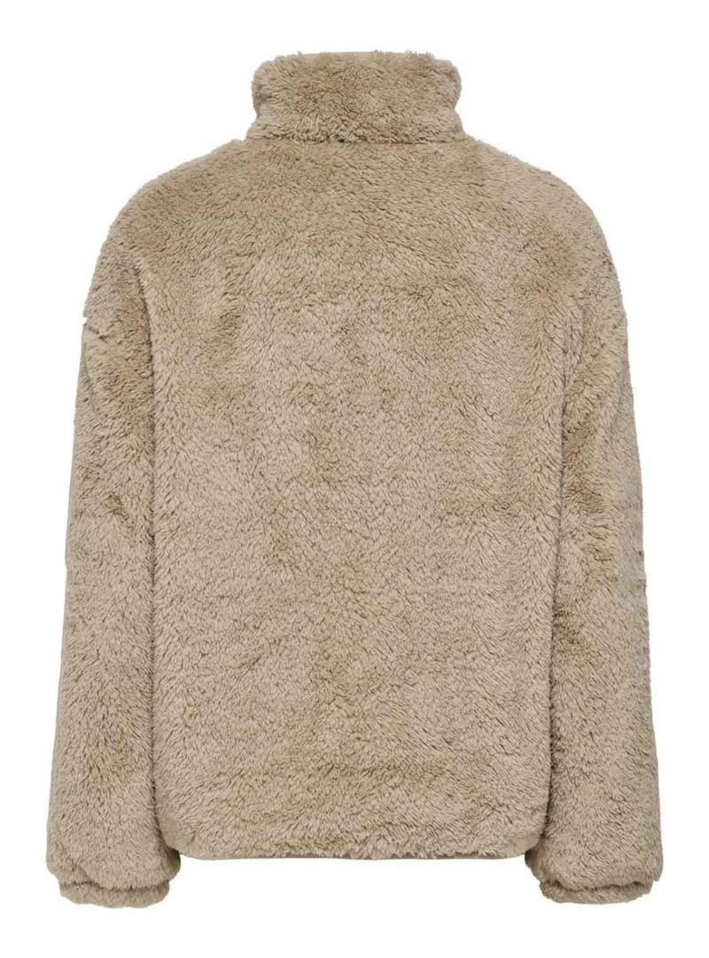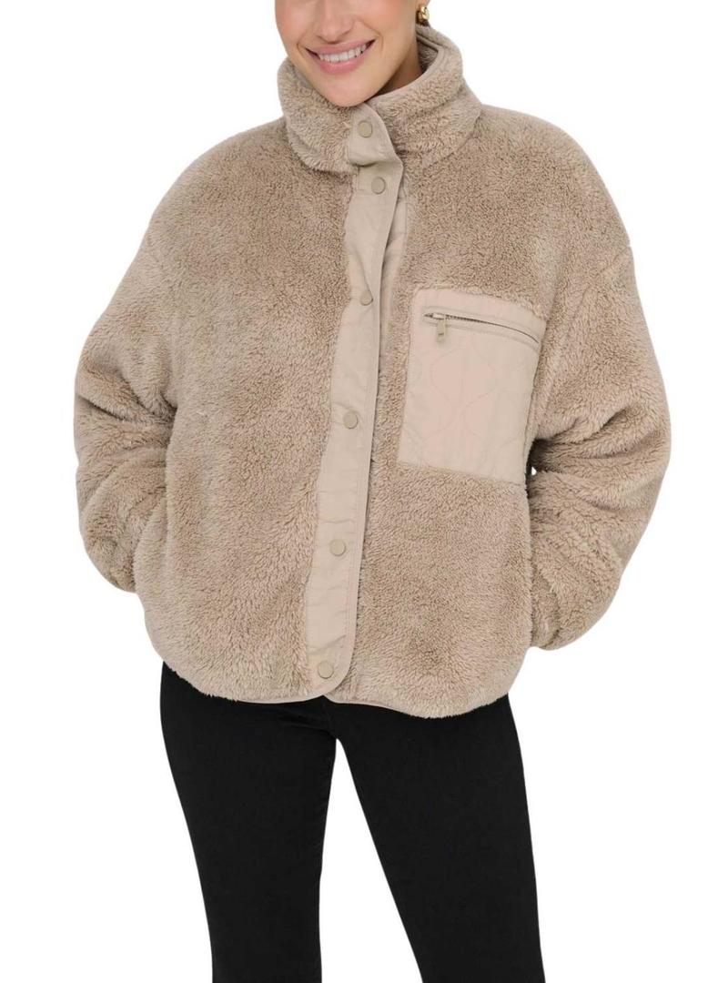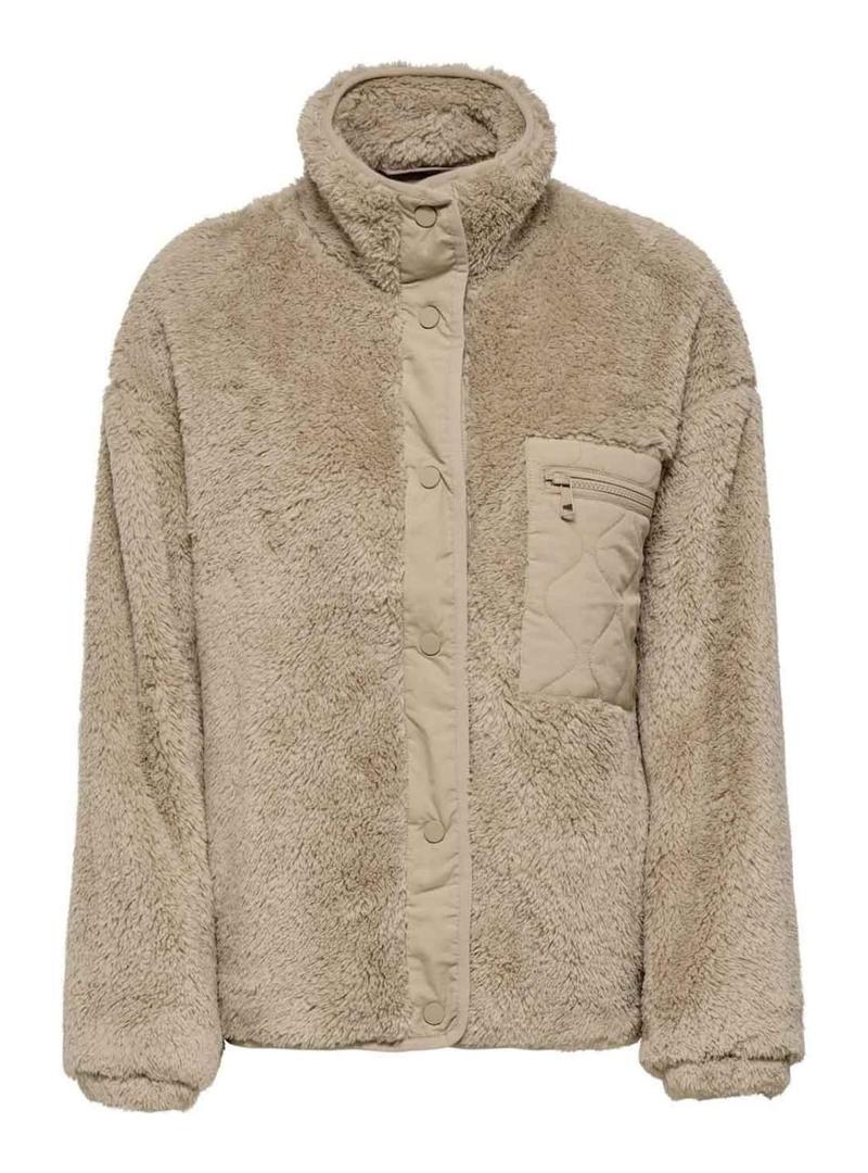 Apenas devolva a tradução para o português: Jaqueta Only. Modelo Cantact. Estilo sherpa. Cor bege. Gola alta. Fechamento com botões. Bolso de remendo no peito com zíper. Tecido de pelo macio. Bolsos laterais. Detalhes em tecido liso.