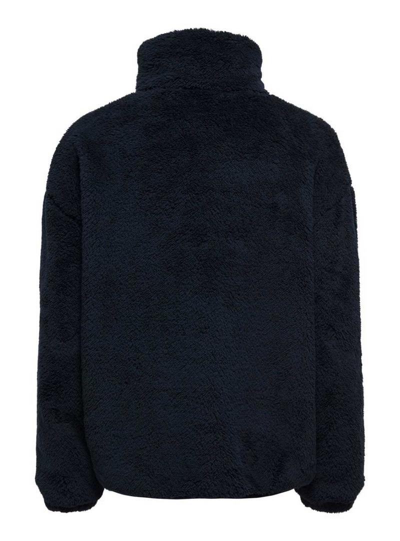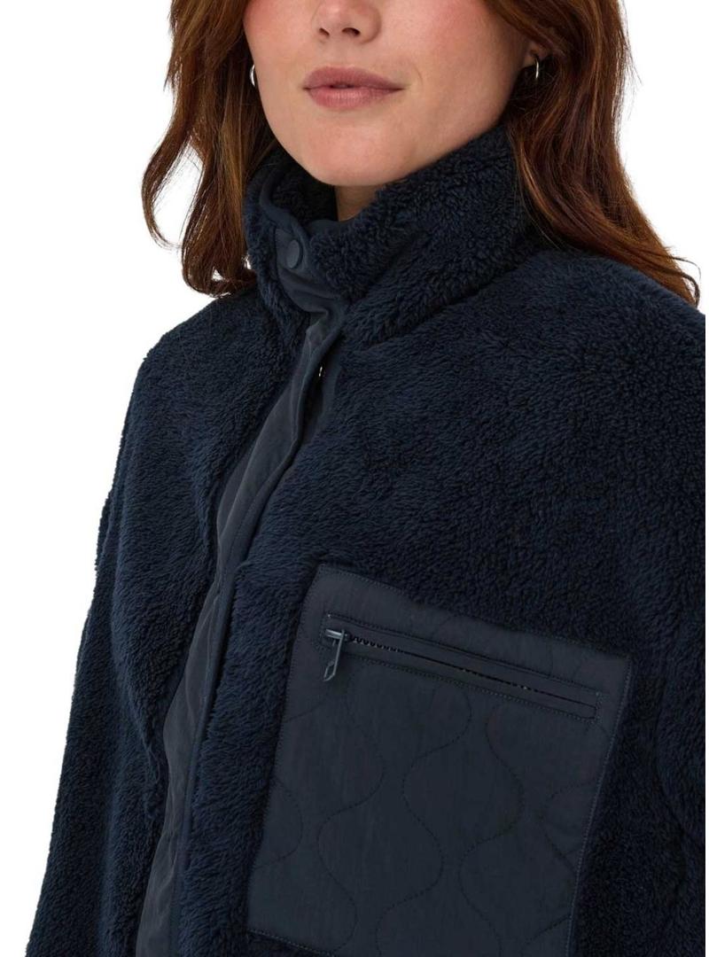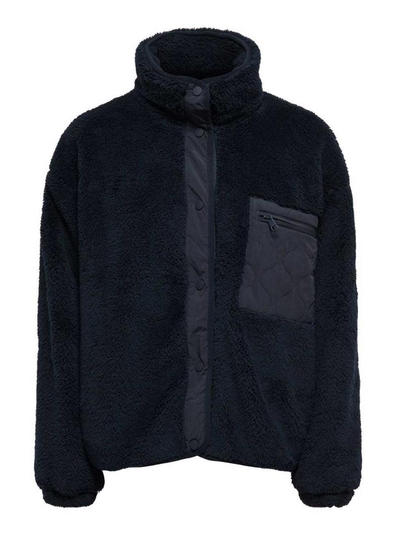 Jaqueta Only. Modelo Cantact. Estilo sherpa. Cor azul marinho. Gola alta. Fecho com botões. Bolso de remendo no peito com fecho de correr. Tecido de pelos macios. Bolsos laterais. Detalhes em tecido liso.
