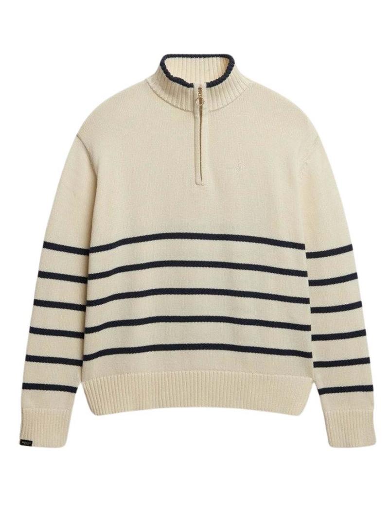 Camisola Superdry. Modelo em malha com meio zíper. Cor bege. Corte oversized. Gola alta com fecho de zíper. Padrão listrado em azul marinho. Logotipo bordado no peito. Acabamentos canelados.