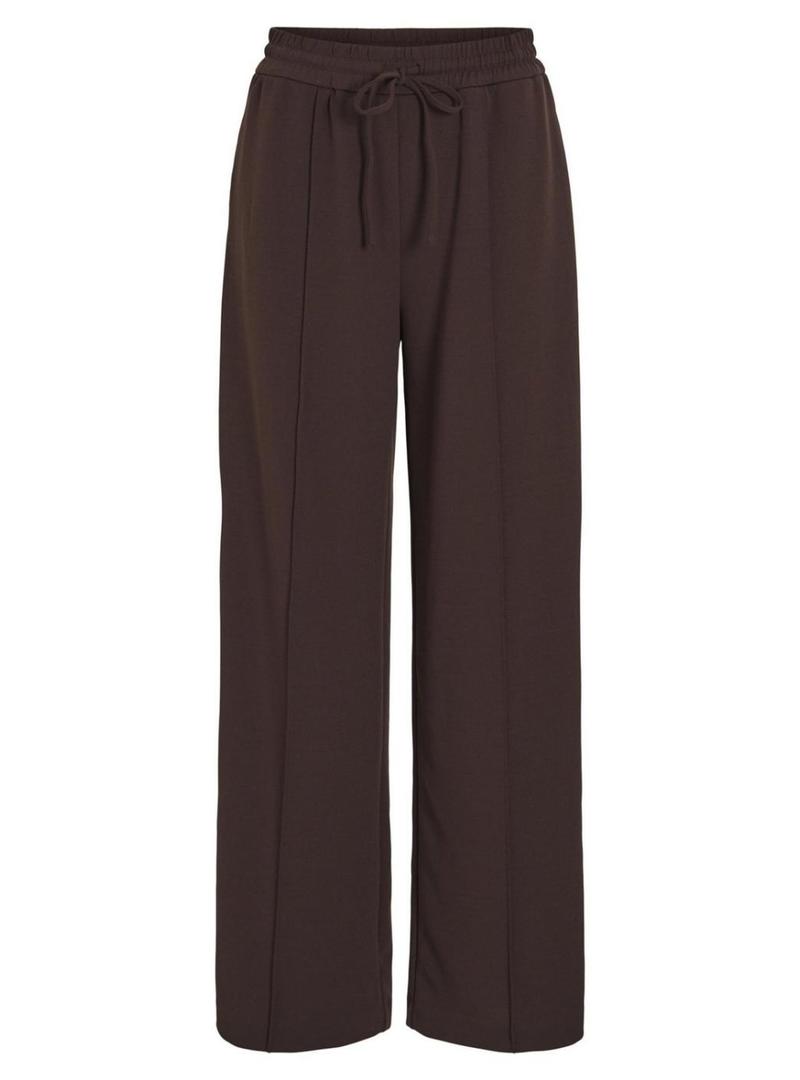 Calça Vila. Modelo Viclua. Cor marrom. Cintura alta elástica e ajustável com cordão. Bolsos laterais. Perna larga. Costuras centrais decorativas. Tecido elástico.