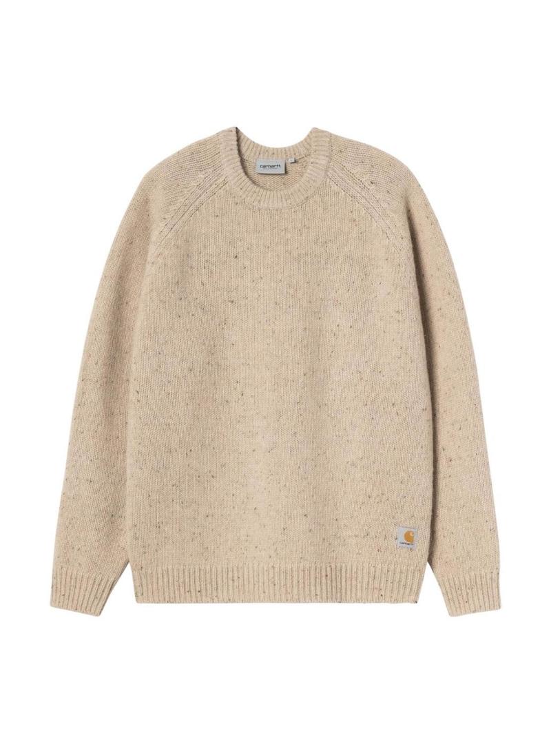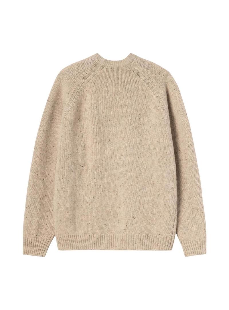 Camisola Carhartt. Modelo Anglistic. Cor bege. Gola redonda. Extremidades caneladas. Ajuste regular. Etiqueta quadrada da marca na parte de baixo. Manga longa raglan. Tecido de lã em ponto grosso mesclado.