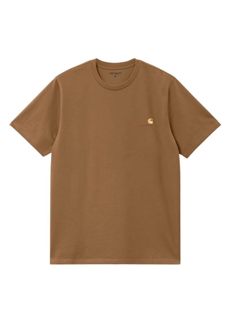Camiseta Carhartt. Modelo American Script. Cor marrom. Gola redonda. Ajuste quadrado. Manga curta. Estilo básico. Logotipo bordado no peito.