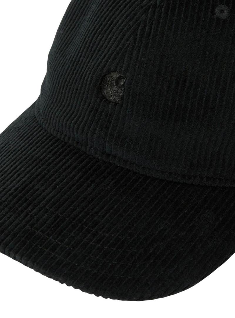 Boné Carhartt. Modelo Harlem. Cor preta. Tecido de veludo cotelê. Logotipo bordado na mesma cor. Ilhós para transpiração. Fita traseira ajustável com fivela metálica da marca.