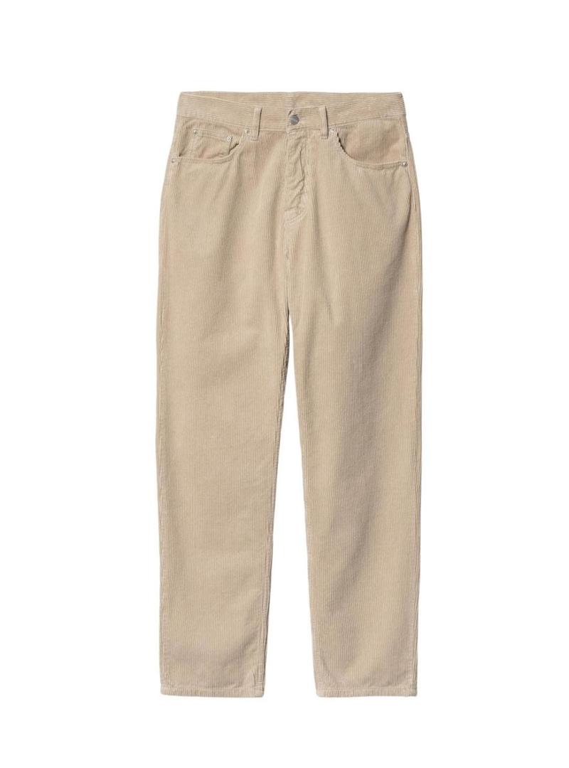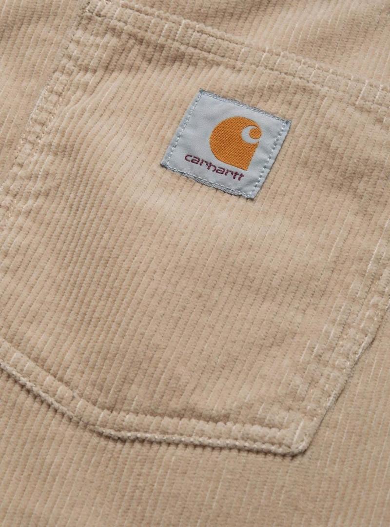 Calça Carhartt. Modelo Newel. Cor bege. Tecido de veludo cotelê suave e leve. Fecho com botão e zíper. Corte slim. Perna ligeiramente folgada. Cinco bolsos. Etiqueta da marca no bolso traseiro.