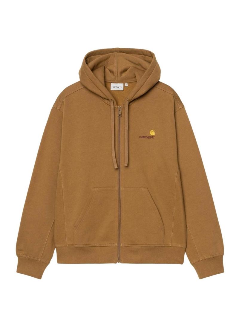 Moletom Carhartt. Modelo American Script. Cor marrom. Zíper de fechamento. Ajuste folgado. Capuz com cordão ajustável. Extremidades acanaladas e elásticas. Logo bordado no peito.