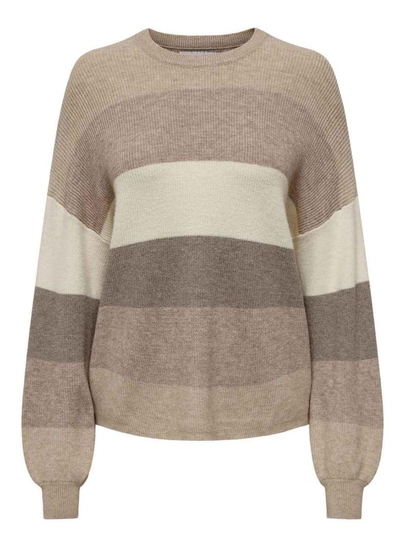 Camisola Only. Modelo Latia. Cor marrom. Gola redonda. Ajuste folgado. Extremidades das mangas elásticas. Tecido às riscas em tons nude.