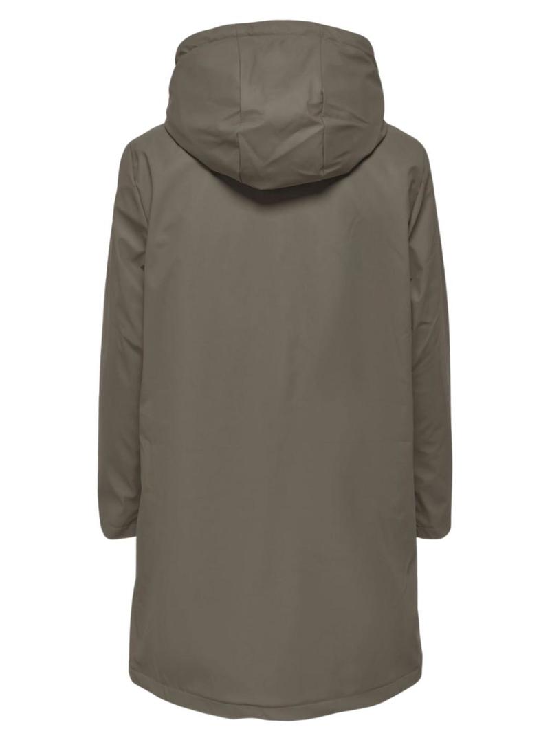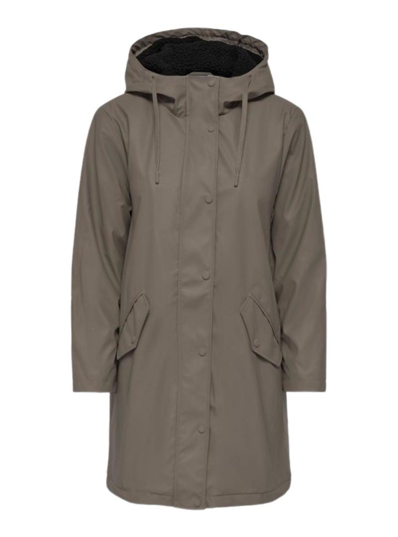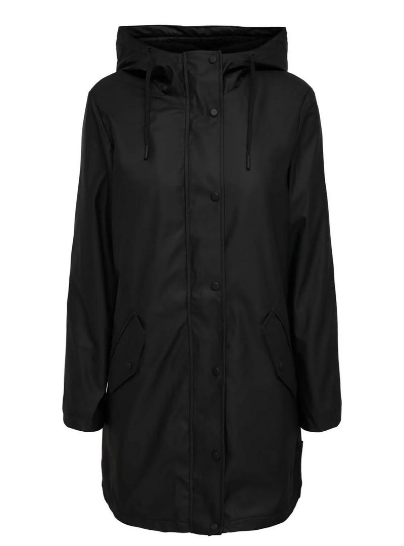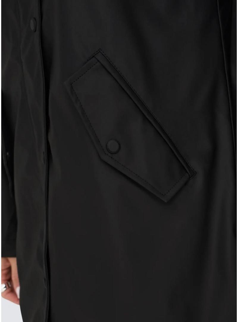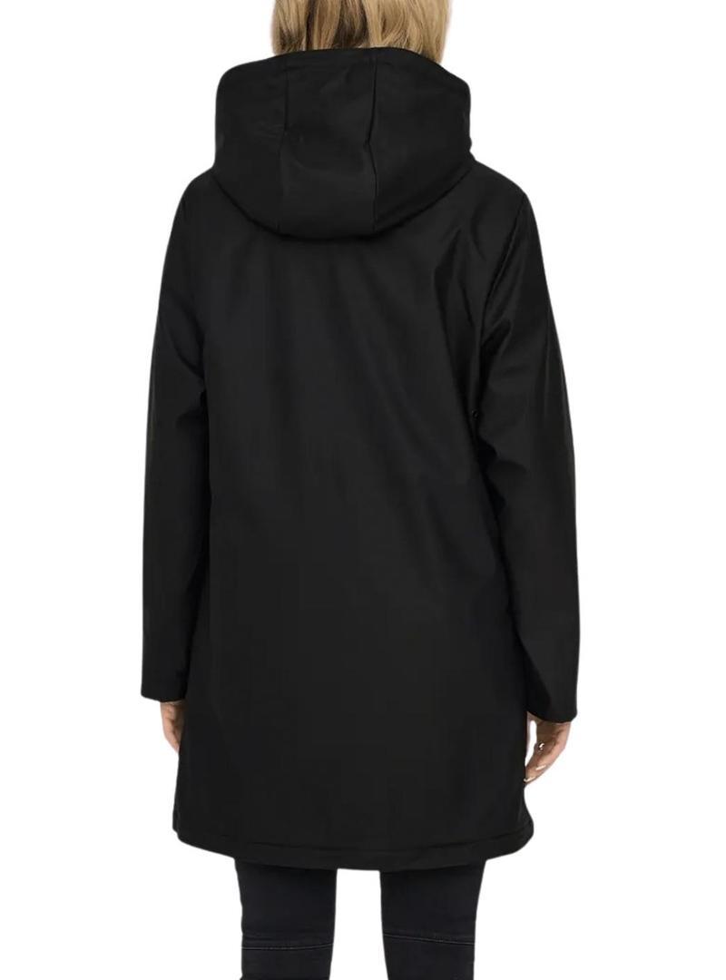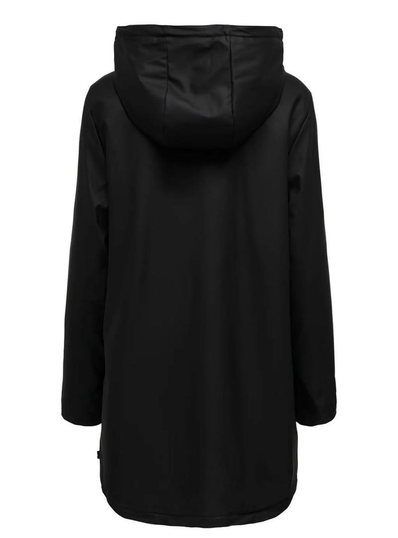 Impermeável Only. Cor preta. Capuz ajustável com cordão. Tecido impermeável. Fecho com zíper e botões. Bolsos na frente com abas e botões. Corte regular. Forrado com pele de carneiro. O modelo veste o tamanho S.