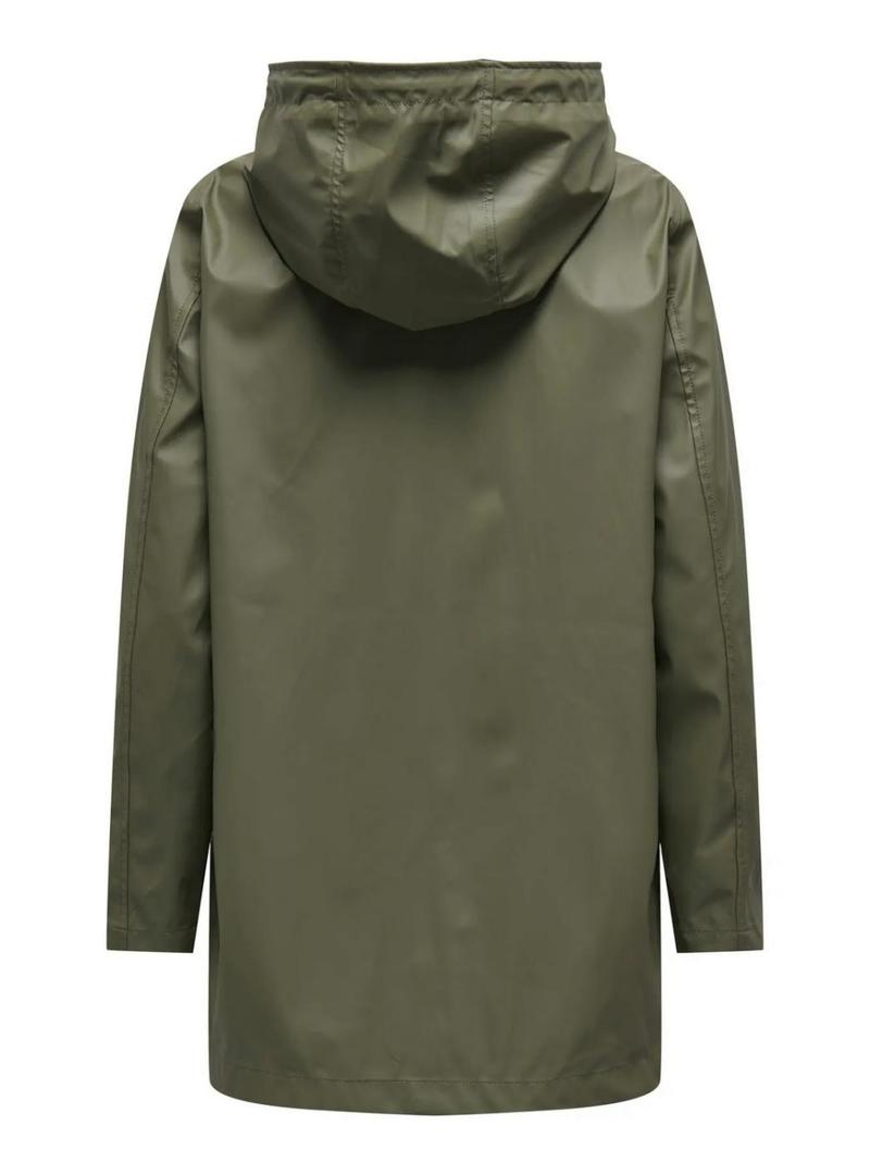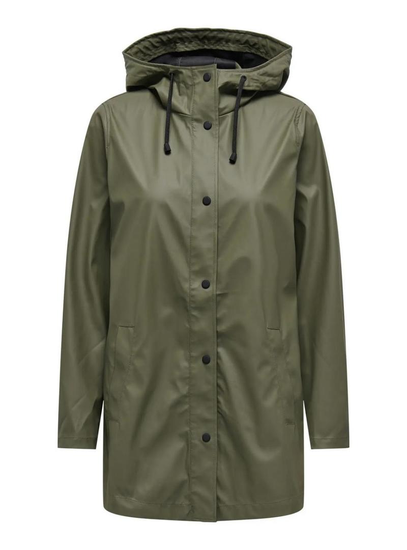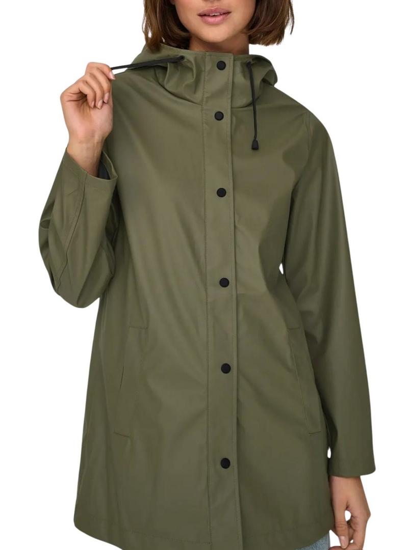 Capa de chuva Only. Cor verde. Modelo Newellen. Capuz ajustável com cordões. Tecido impermeável. Fecho com botões de pressão. Bolsos laterais. Ajuste reto. Estilo básico. Tecido leve.