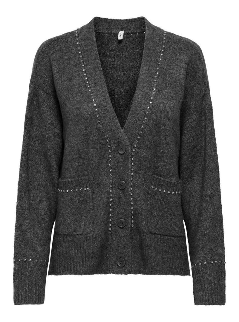 Jaqueta Only. Modelo Elsie. Cor cinza. Decote em V. Fecho com botões. Ajuste folgado. Extremidades caneladas. Bolsos laterais de patch. Detalhes com tachas.