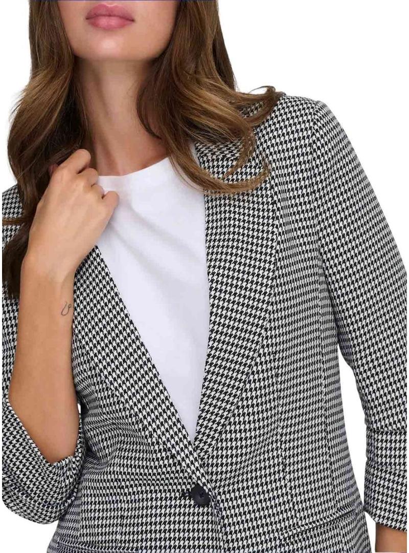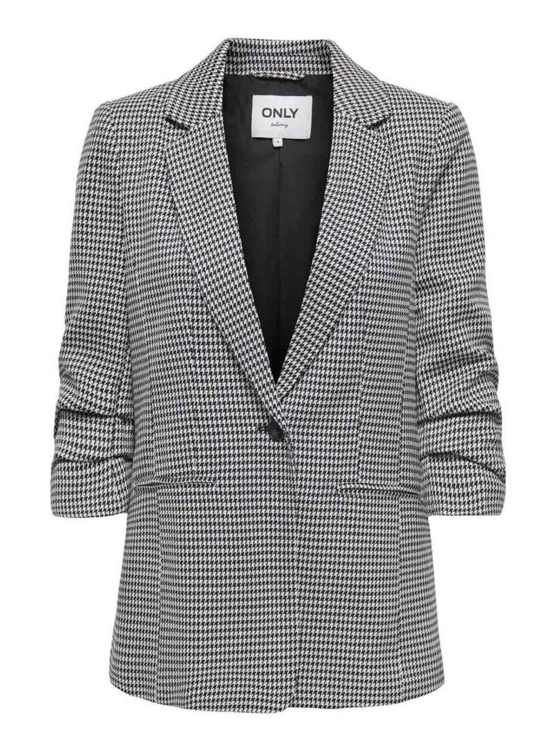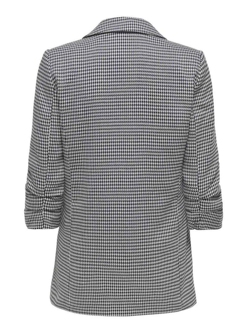 Blazer Only. Modelo Lettie. Cor preto e branco. Estampa de pé de galinha. Fechamento com um botão. Bolsos de vivo laterais. Manga 3/4 franzida. Ajuste regular.