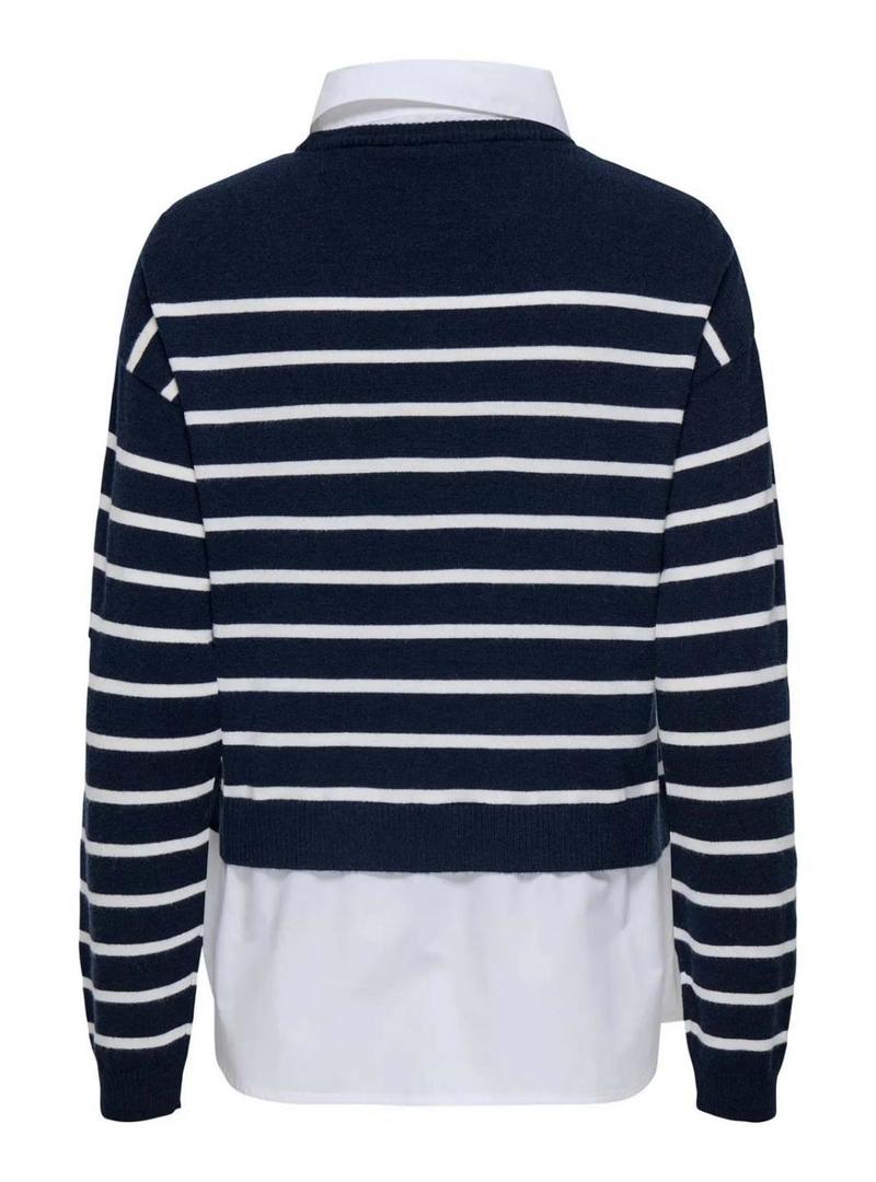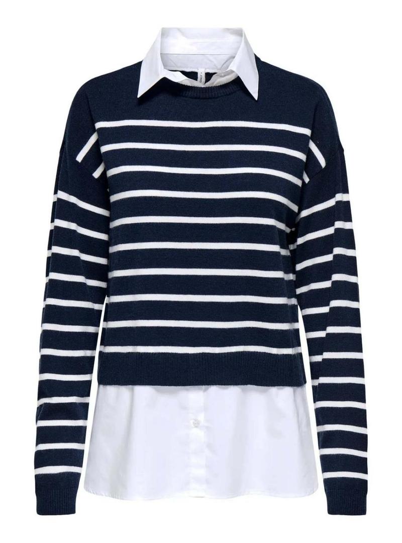 Camisola Only. Modelo Payson. Cor azul marinho com listras em branco. Ombros caídos. Camisa integrada com golas e barra em branco.