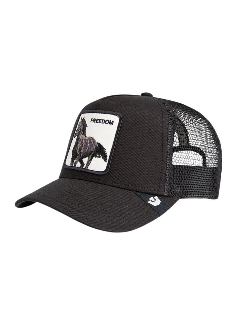 Boné Goorin Bros. Coleção Animal Farm. Modelo Freedom. Cor preta. Patch de um cavalo bordado na frente. Parte traseira em malha respirável. Parte da frente lisa. Alça traseira ajustável. Etiqueta lateral da marca.