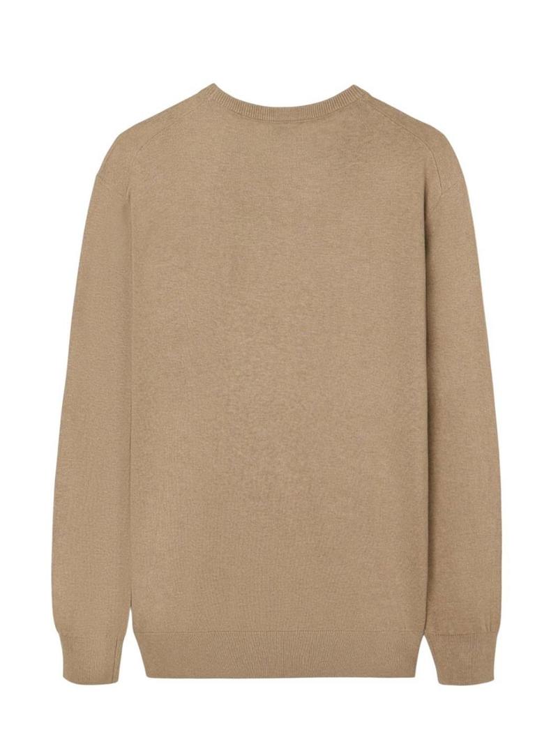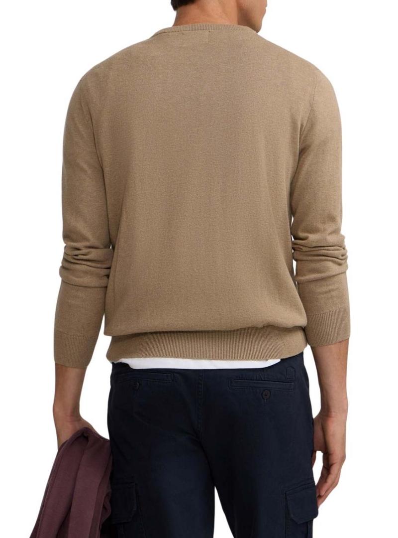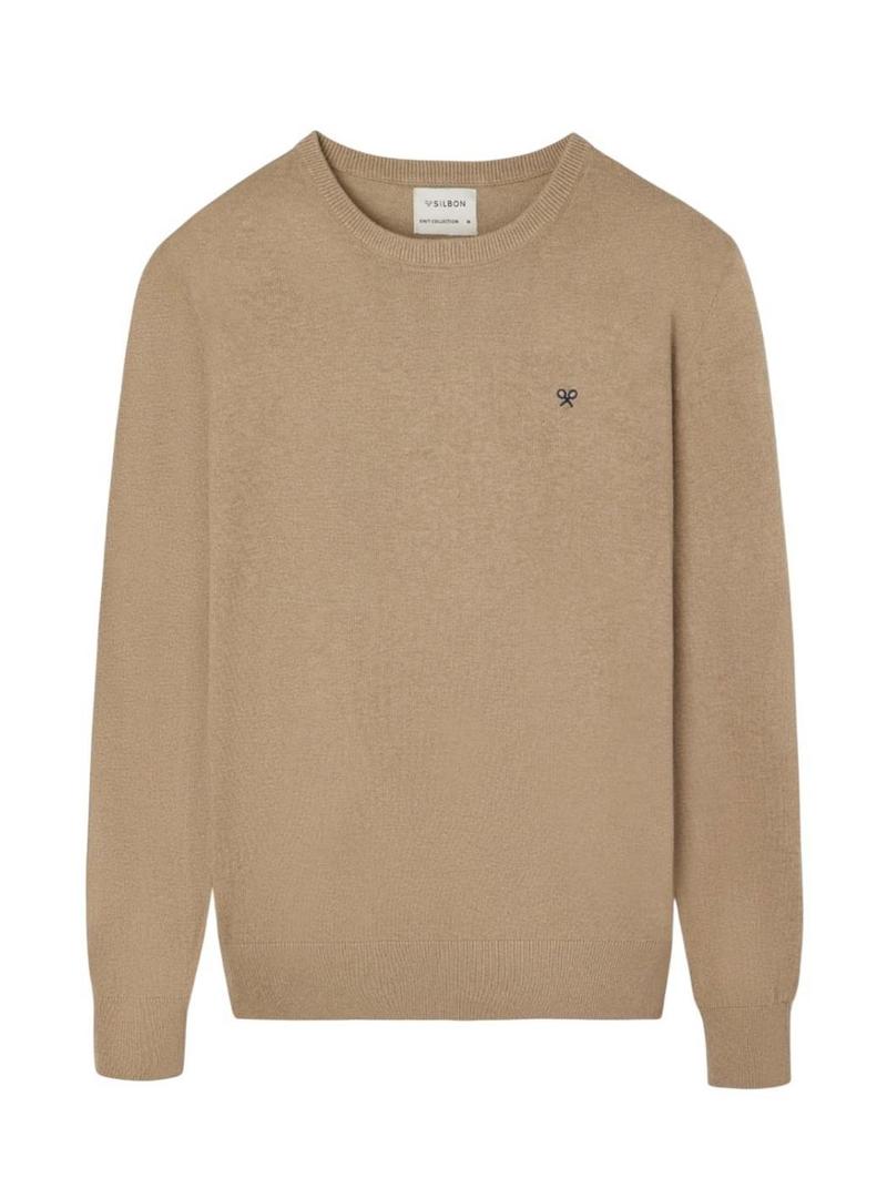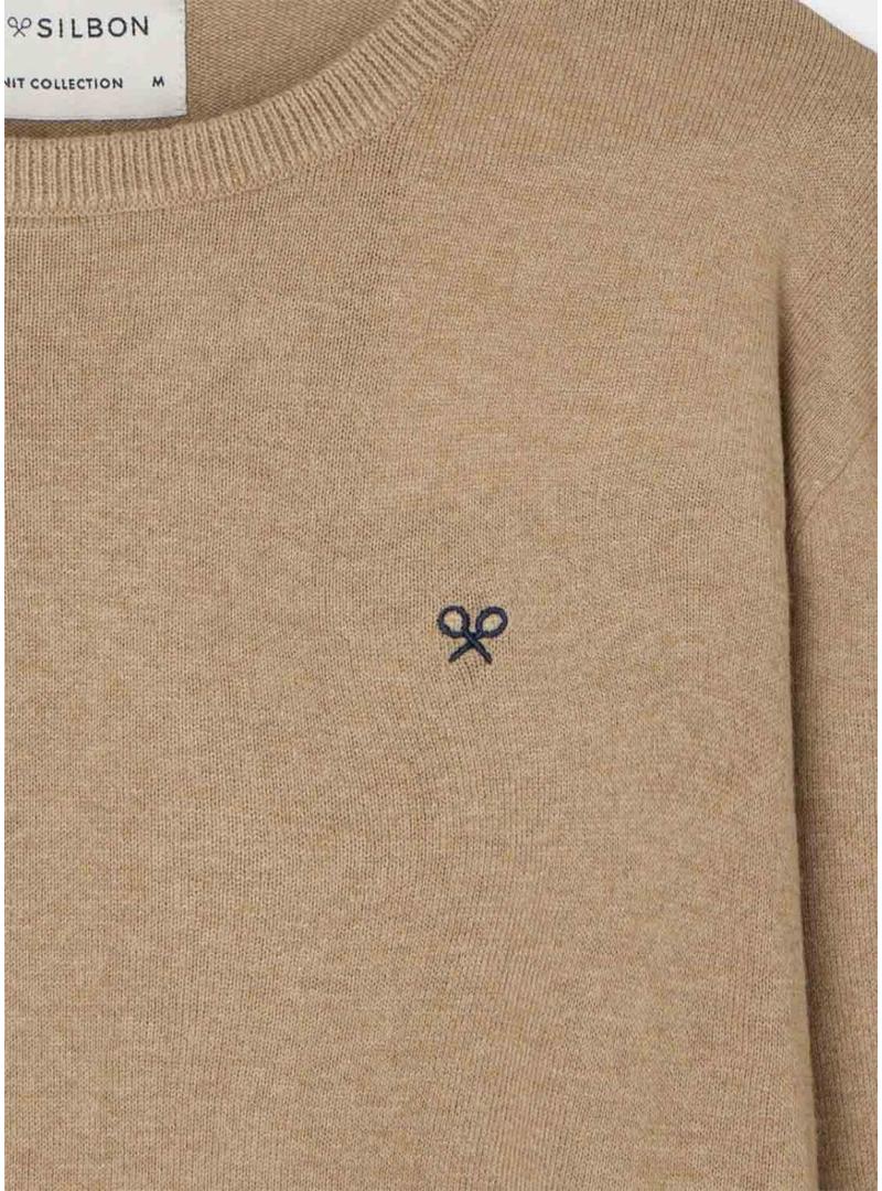 Camisola Silbon. Modelo básico. Cor bege. Gola redonda. Extremidades caneladas. Ajuste regular. Logotipo bordado no peito.