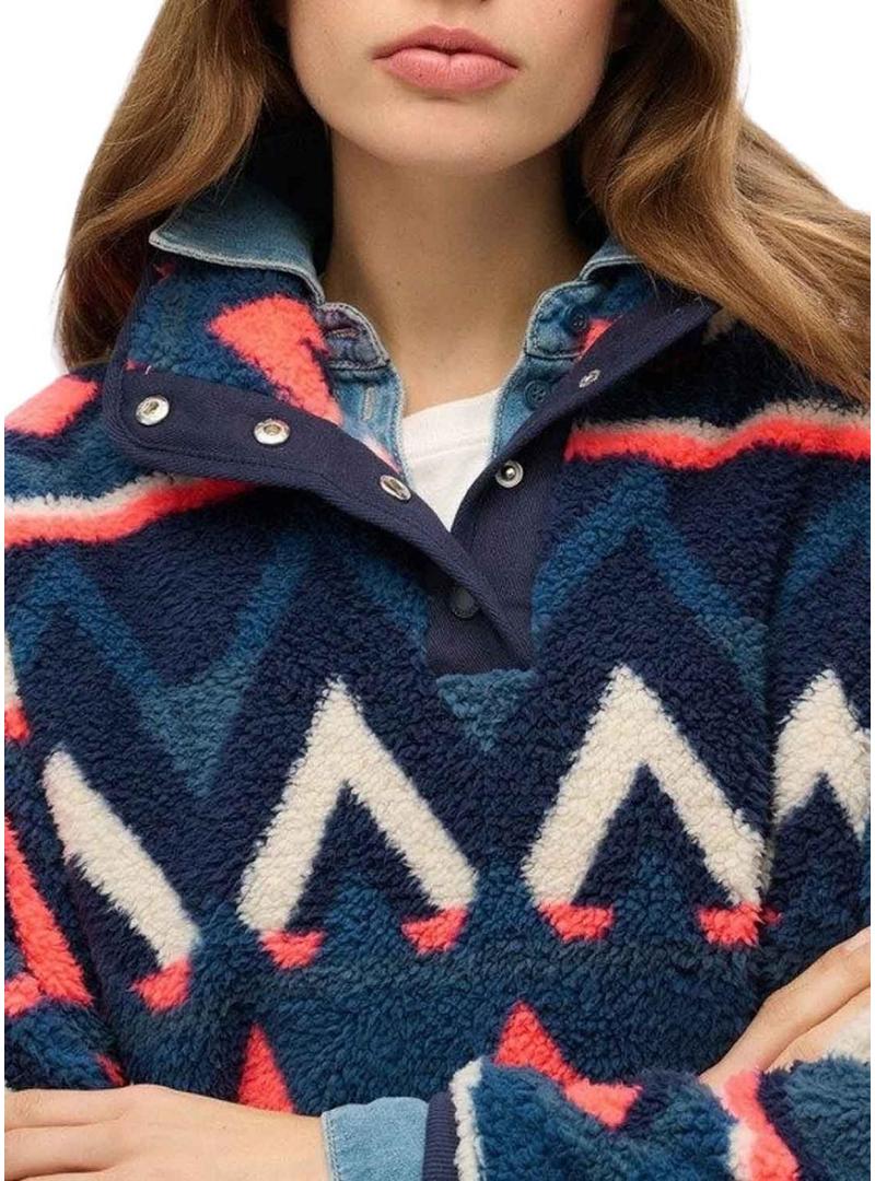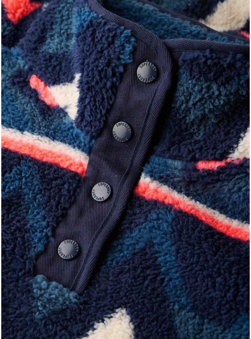 Polar Superdry. Modelo Printed Henley. Padrão étnico multicolorido. Predomina a cor azul marinho. Gola alta com quatro botões de pressão. Barra com cordão de ajuste elástico. Logotipo da Superdry bordado na manga. Tecido super macio. Ombros levemente caídos. Punhos canelados com elástico. Corte folgado.