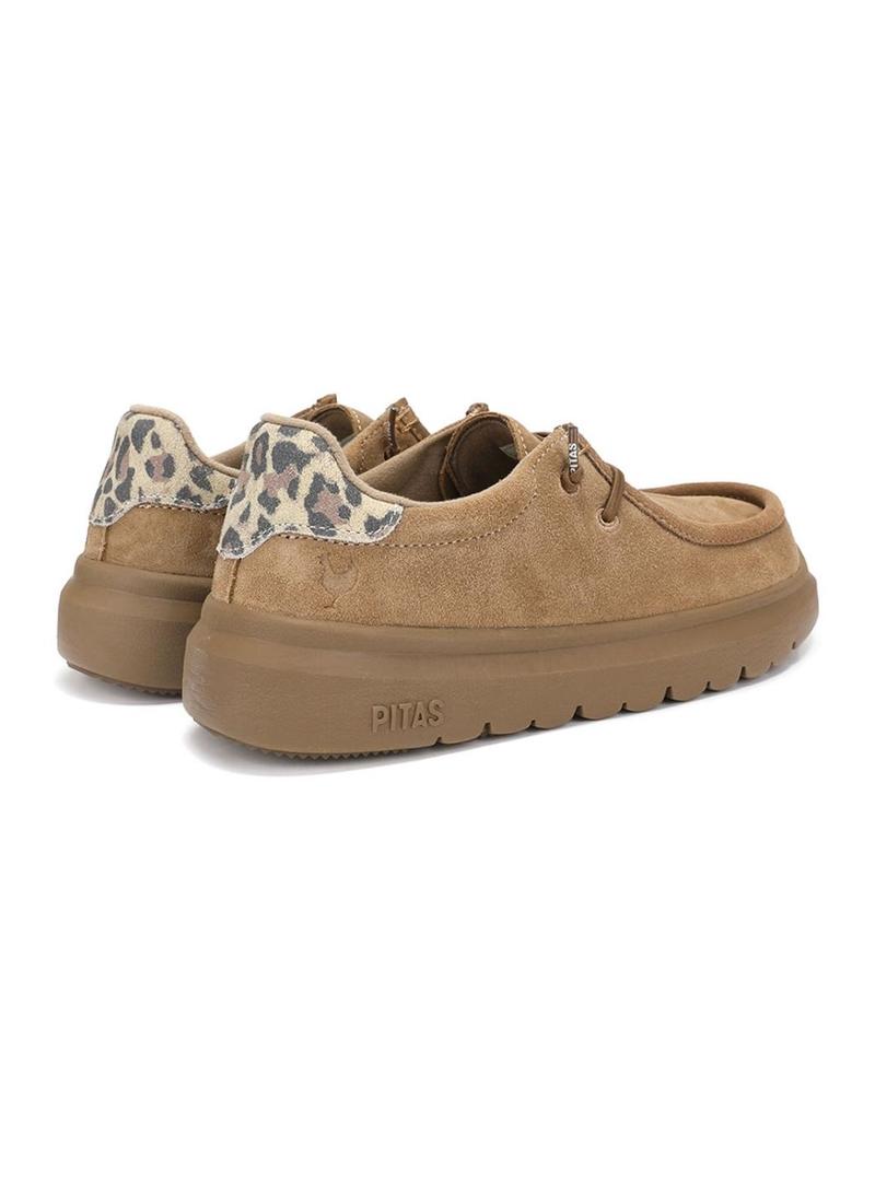 Sapatos Walkin Pitas para mulher. Modelo Lyon. Cor camelo. Corte em Nobuck hidrofugado repelente à água com cordões elásticos. Forro têxtil que proporciona conforto. Palmilha de EVA com palmilha de couro. Sola TRACK de EVA ultraleve com borracha antiderrapante, que oferece excelente aderência e isolamento para dias chuvosos e úmidos. Detalhe animal print no calcanhar.