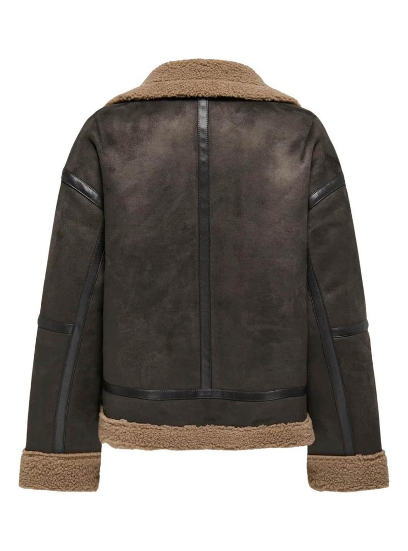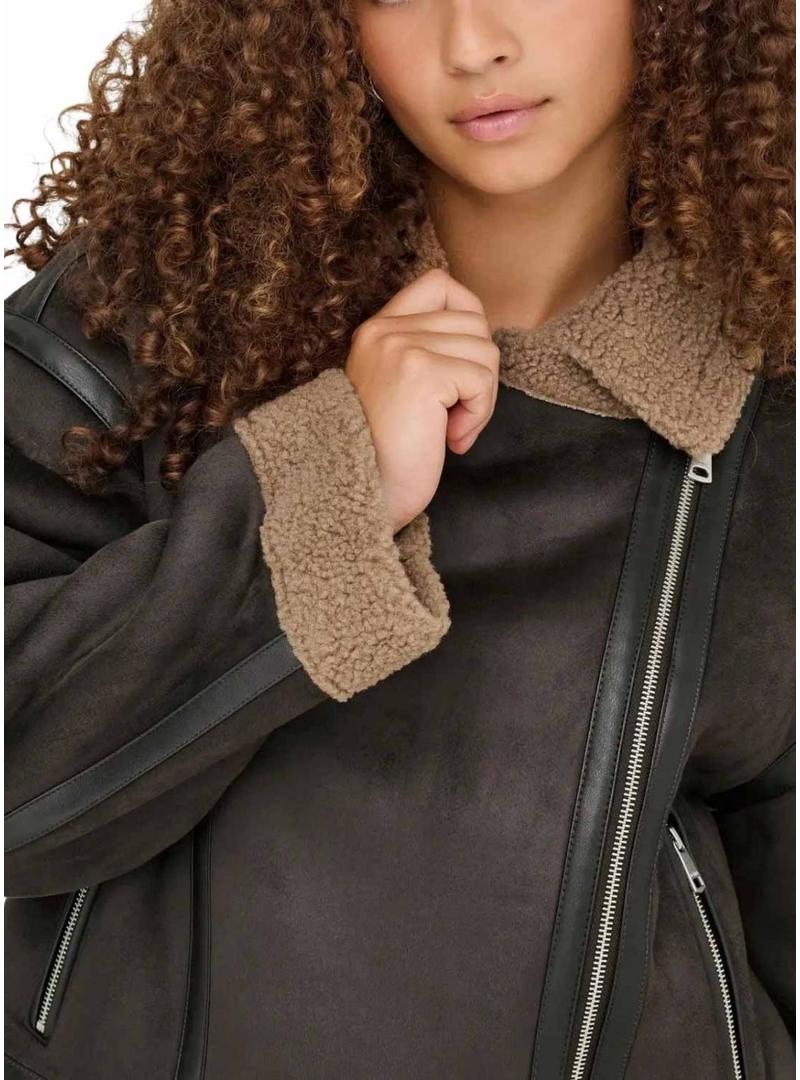 Jaqueta Only. Modelo Onlkendra. Cor marrom. Fecho de zíper assimétrico. Gola de lapela de carneiro. Tecido de efeito pele. Bolsos laterais com fecho de zíper. Comprimento: curto. Acabamentos decorativos com tecido de carneiro.