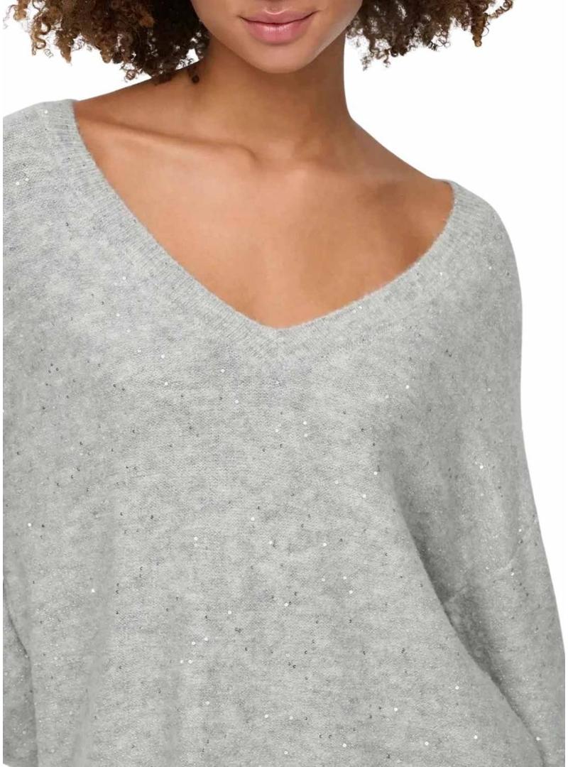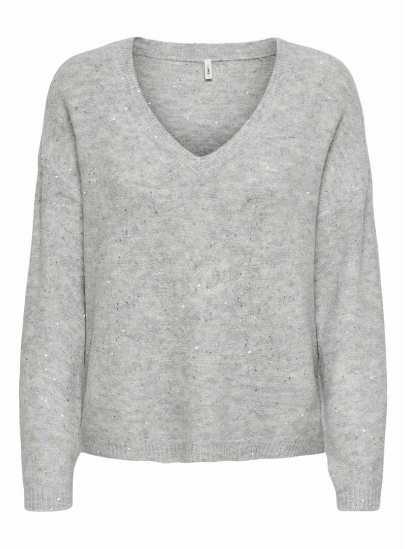 Camisola de malha da Only. Modelo Onlarizona. Cor cinza claro mesclado. Decote em V. Manga comprida. Mistura de tecido elástico. Detalhe de lantejoulas prateadas. Corte regular.