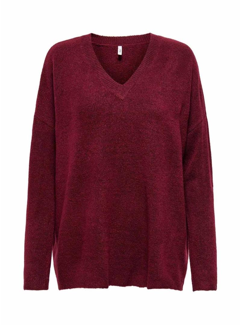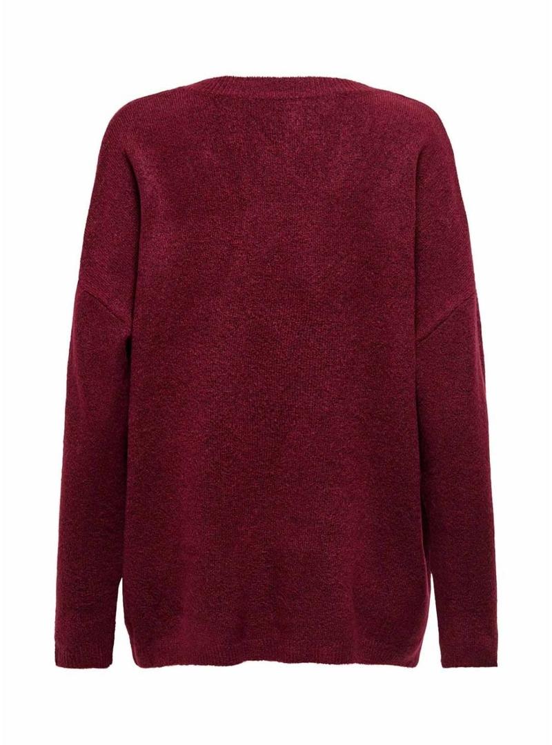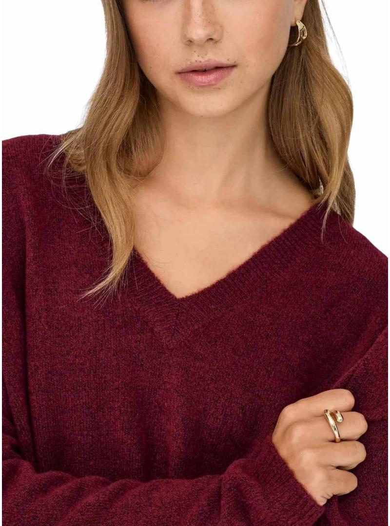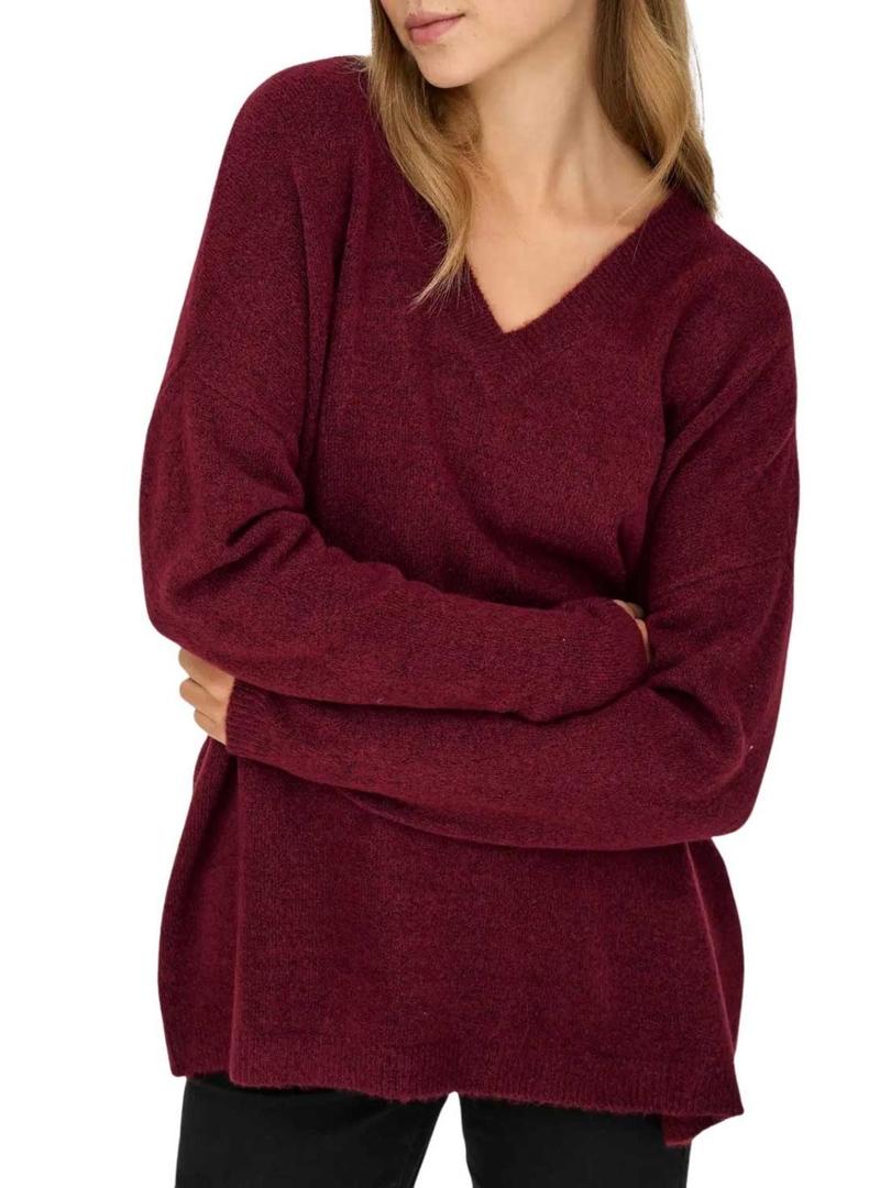 Camisola de malha Only. Modelo Talio. Cor bordô. Motivo de listras. Decote em V. Manga comprida. Ombros caídos. Corte folgado. Malha confortável e flexível.