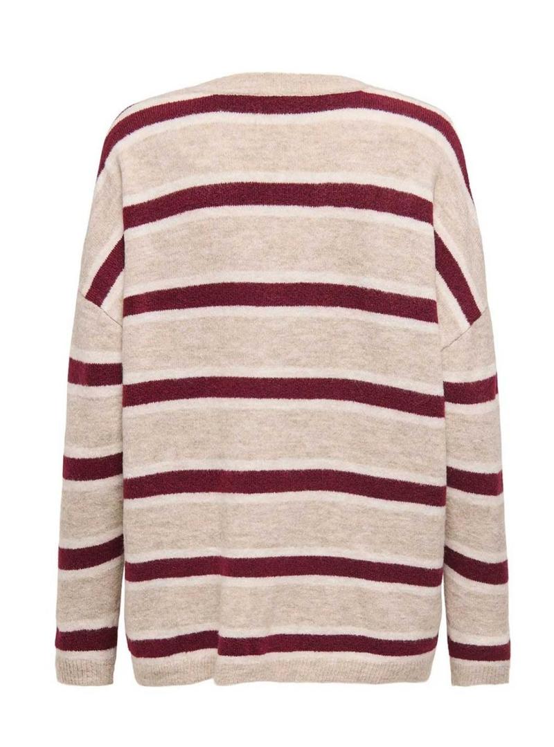 Camisola de malha Only. Modelo Talio. Cor bege e bordô. Motivo de riscas. Decote em V. Manga comprida. Ombros caídos. Corte folgado. Malha confortável e flexível.
