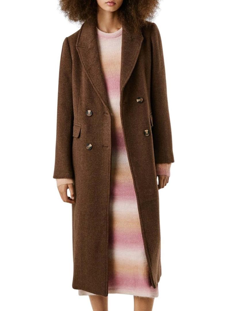 Casaco Pepe Jeans. Modelo Taylor. Cor marrom. Corte longo. Tecido em mistura leve de lã. Design cruzado com fecho de dupla abotoadura. Gola com lapela de bico. Bolsos laterais com lapela. Abertura traseira na parte inferior. Forro interior acetinado. Patches de couro com logo PEPEJEANS nas costas. Acabamento interior com logo estampado.