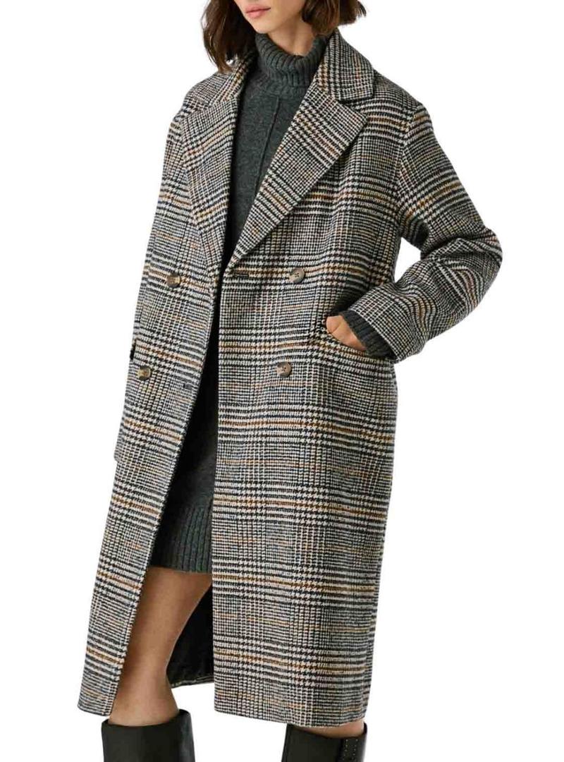 Casaco Pepe Jeans. Modelo Tasha. Cor cinza. Tecido com mistura de lã. Design cruzado com fecho de dupla abotoadura. Gola com lapela entalhada. Bolsos laterais com lapela. Estampa de pé de galinha em toda a peça. Fita do mesmo tecido na cintura traseira. Abertura traseira na parte inferior. Patch de couro com logo PEPEJEANS nas costas.