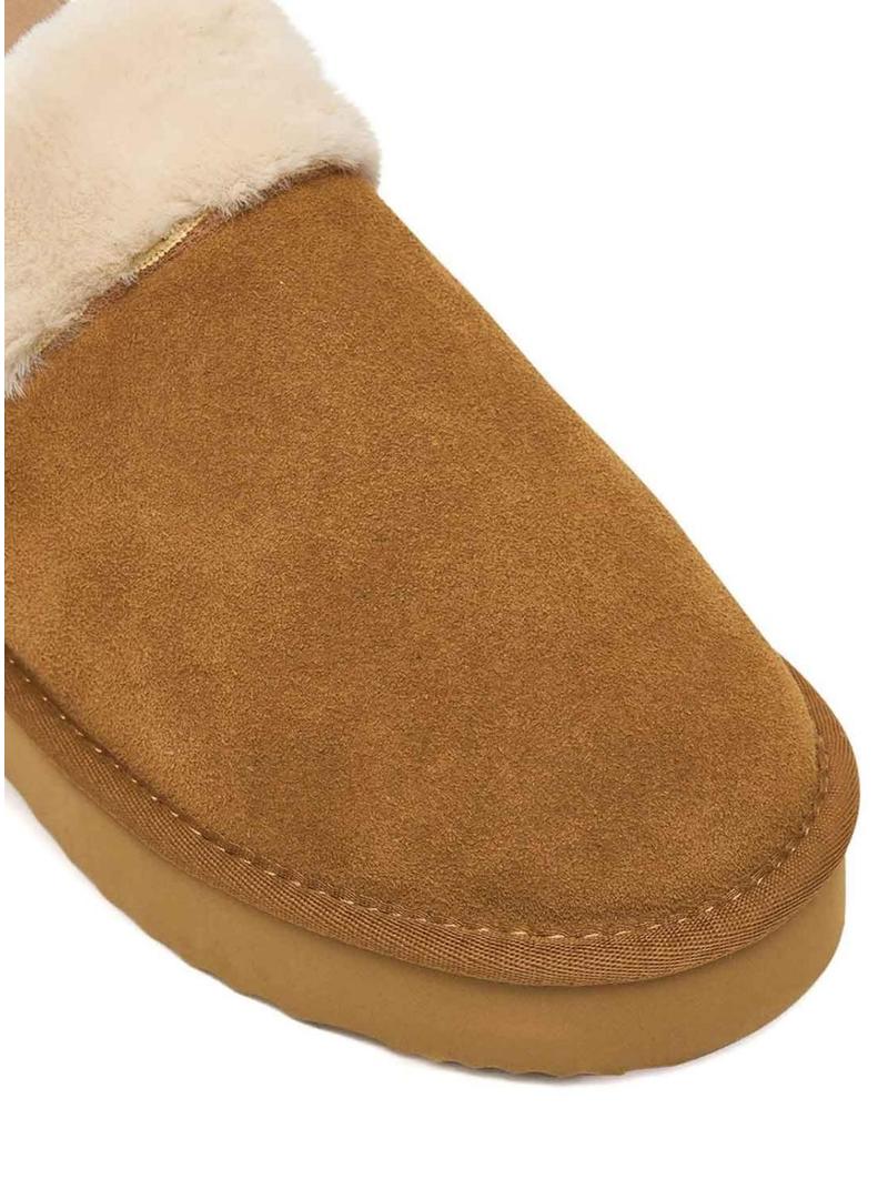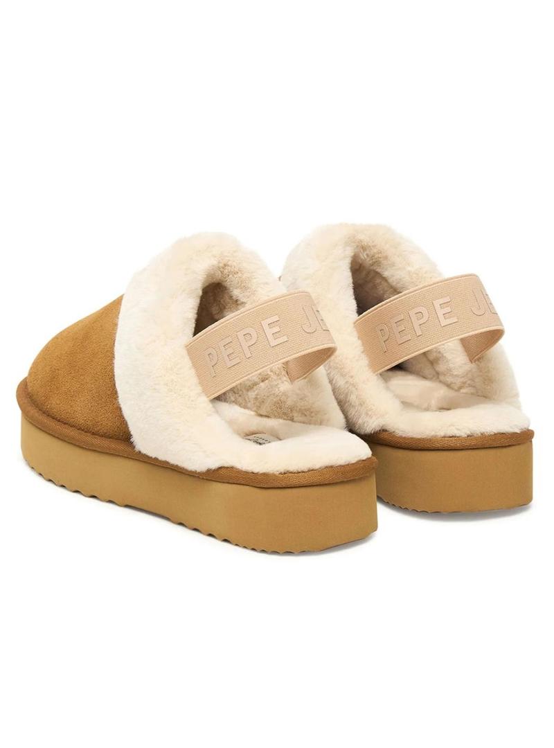 Tamancos Pepe Jeans. Modelo Dissy. Cor caramelo. Feito em camurça bovina. Detalhes de pelúcia na parte superior. Fita elástica com logo PEPEJEANS no calcanhar. Forro interior de pelúcia. Sola de plataforma com padrão antiderrapante. Acabamento de sarja na parte superior da sola. Etiqueta com logo PEPEJEANS na palmilha.