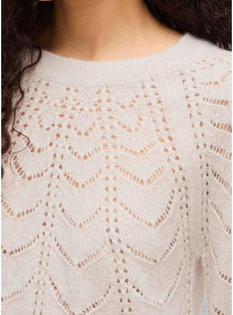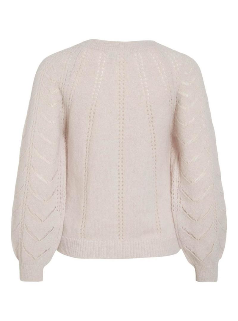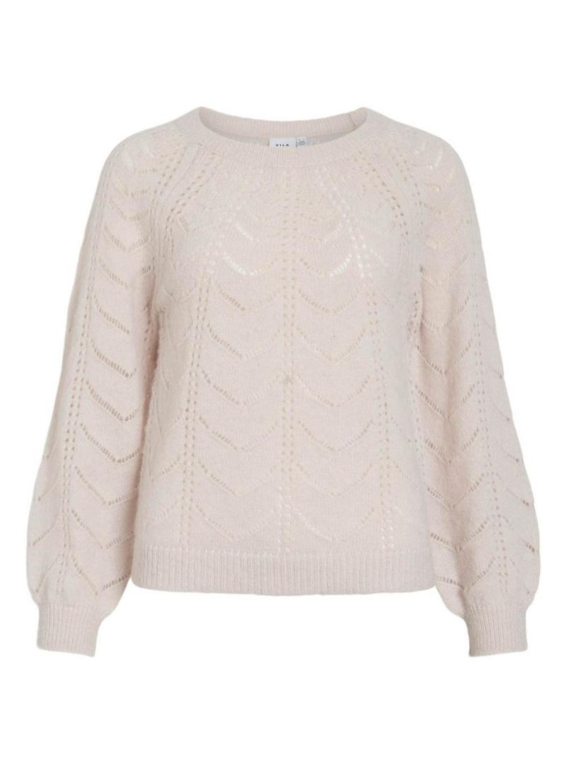 Camisola Vila. Modelo Tuli. Cor bege. Gola redonda. Extremidades caneladas. Manga raglã com volume. Tecido com rendas. Ajuste folgado.