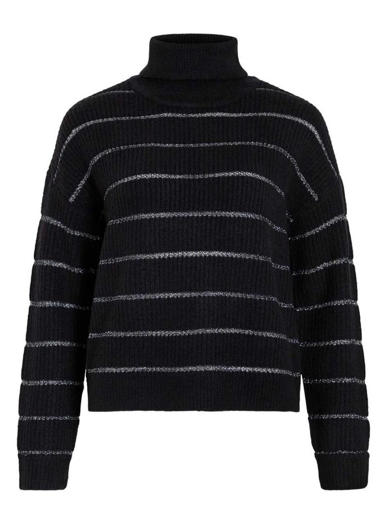 Camisola Vila. Modelo Vizaza. Cor preta. Gola alta. Ajuste folgado. Tecido canelado. Listras horizontais em contraste com fios metalizados.