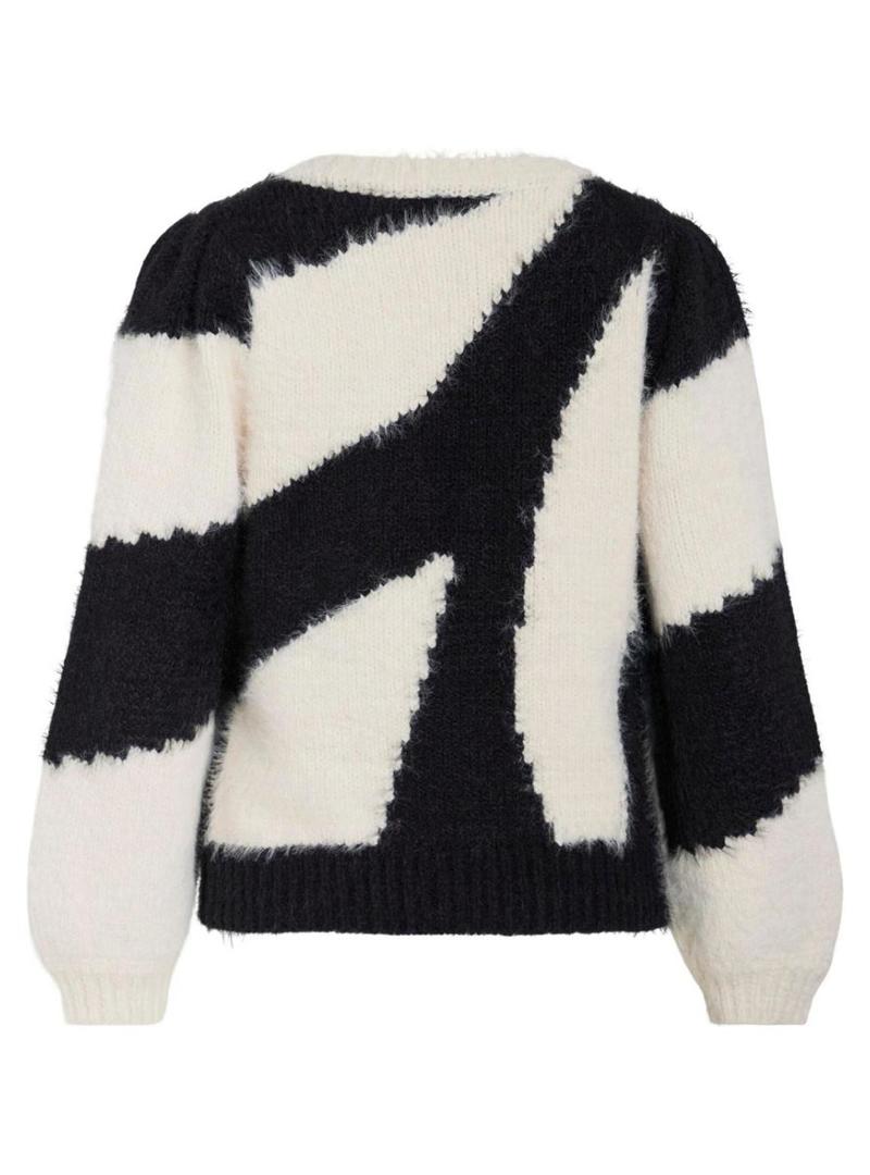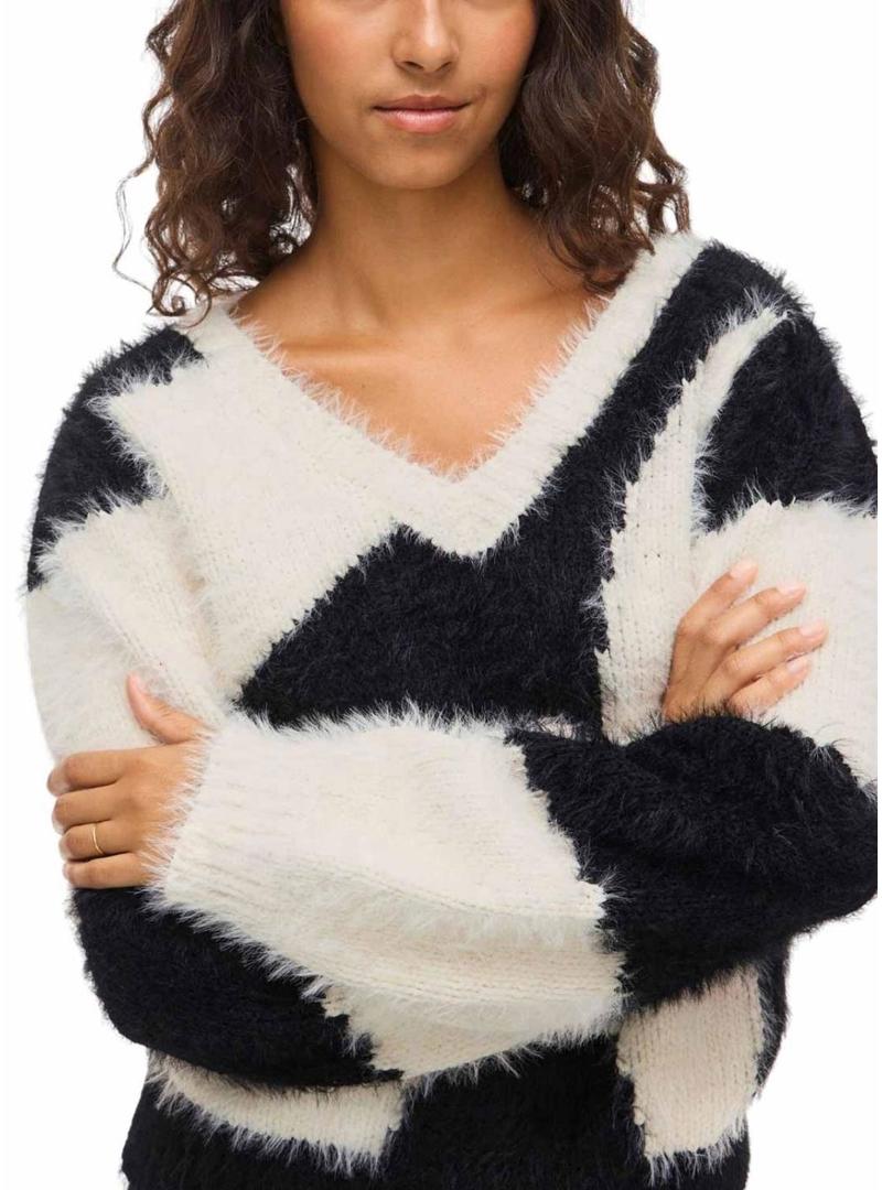 Camisola Vila. Modelo Nuo. Cor preto e branco. Decote em V. Tecido de pelo macio. Extremidades caneladas. Ajuste folgado. Estampado abstrato.
