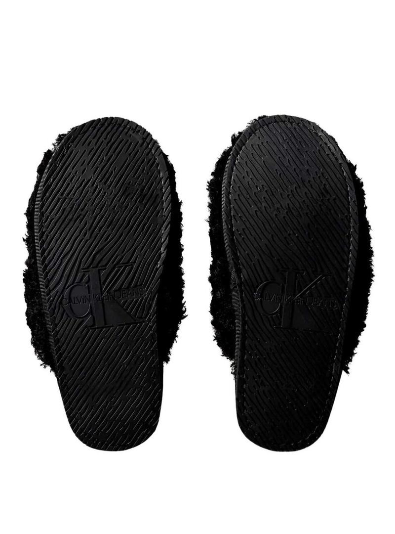 Chinelos para interiores da Calvin Klein. Modelo Close Slipper Fur. Cor preta. Parte superior e forro de pele sintética macia. Sola de TPR. Etiqueta com logotipo monograma na lateral.