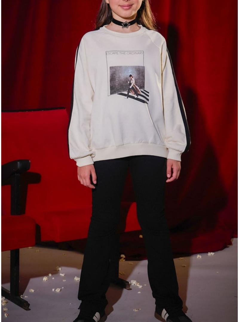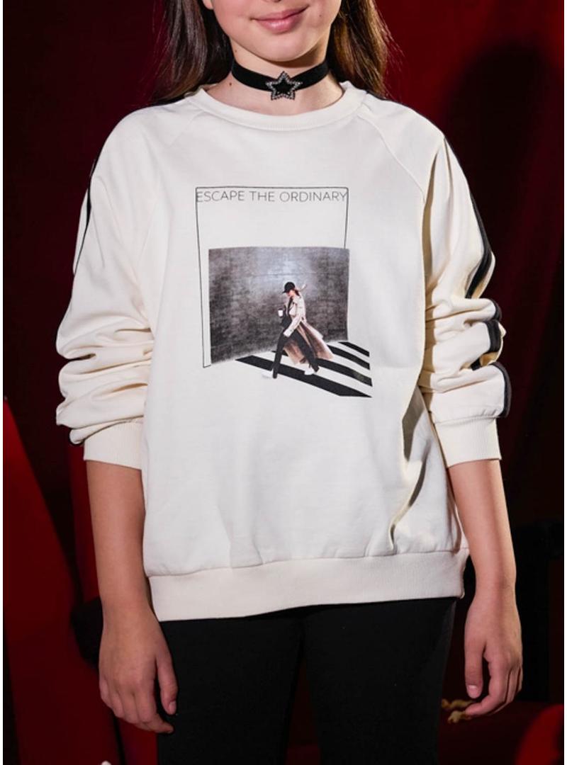 Conjunto Mayoral. Modelo chándal. Camisola bege. Gola redonda. Extremidades elásticas. Imagem estampada no peito com a mensagem Escape The Ordinary. Leggings pretas com corte flare. Cintura elástica.