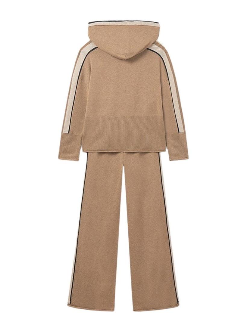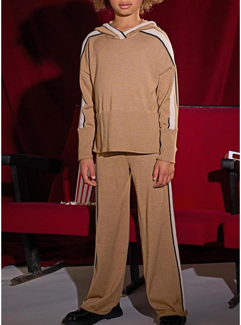 Conjunto Mayoral. Modelo Tricot. Cor camelo. Malha fluida. Camisola de manga comprida. Capuz. Extremidades caneladas. Faixas esportivas em contraste. Calça comprida. Corte folgado. Cintura elástica. Faixa esportiva lateral.