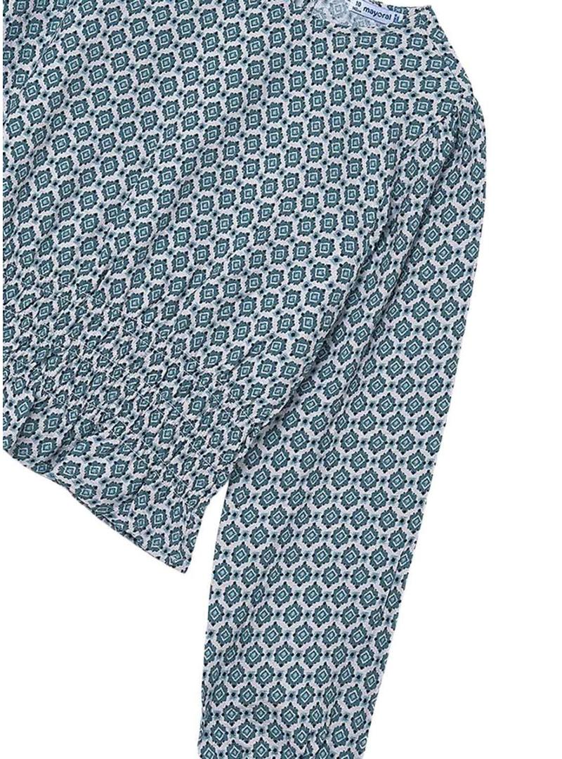 Blusa Mayoral. Modelo geométrico. Cor azul. Gola redonda. Manga comprida com extremidades elásticas. Pequena abertura nas costas com fecho de botão. Tecido de crepe fluido e de queda suave. Detalhes franzidos de ponto smock (ninho de abelha) na barra. Estampado geométrico.