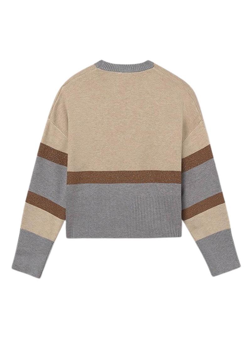 Camisola Mayoral. Modelo metalizado. Cor azul, bege e marrom. Contém poliéster reciclado. Comprimento cropped. Extremidades caneladas. Gola redonda. Confeccionados com fios metalizados.