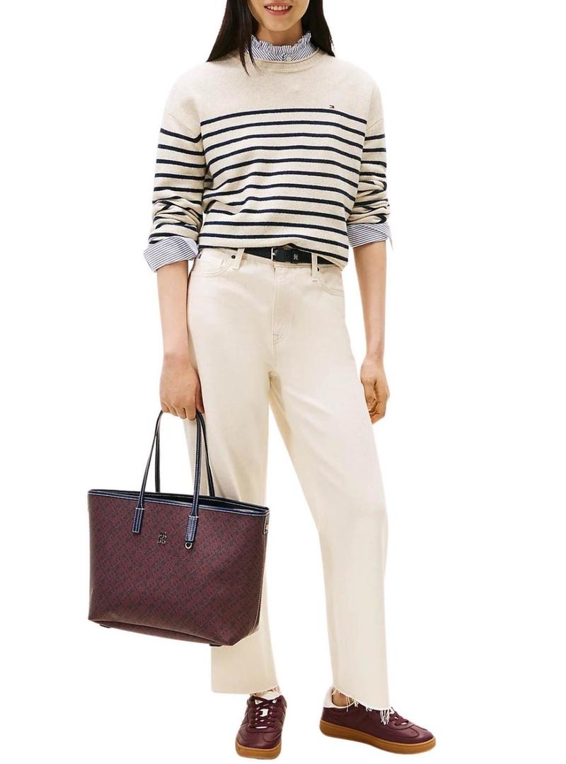 Bolsa Tommy Hilfiger. Modelo Monoplay. Cor azul marinho e vermelho. Estampa monográfica. Estilo tote bag. Três compartimentos principais, um deles com fecho de zíper. Logo metálico. Dimensões: 44 x 15 x 27cm. Capacidade de 17,5 litros.