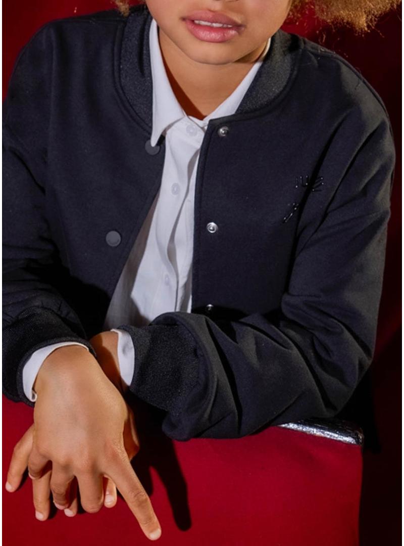 Jaqueta Mayoral. Modelo Bomber. Cor preta. Fecho com botões de pressão na parte da frente. Bolsos na frente. Mensagem em relevo no peito. Gola e extremidades caneladas.