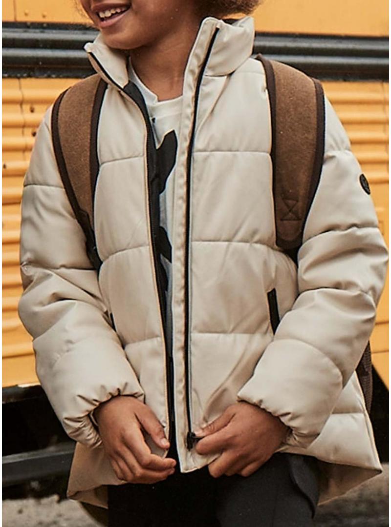 Casaco acolchoado Mayoral. Cor bege. Tecido brilhante. Gola alta. Fecho com zíper. Bolsos laterais. Detalhes em preto. Logotipo circular na manga. Parte de trás mais comprida que a da frente. Ajuste regular.