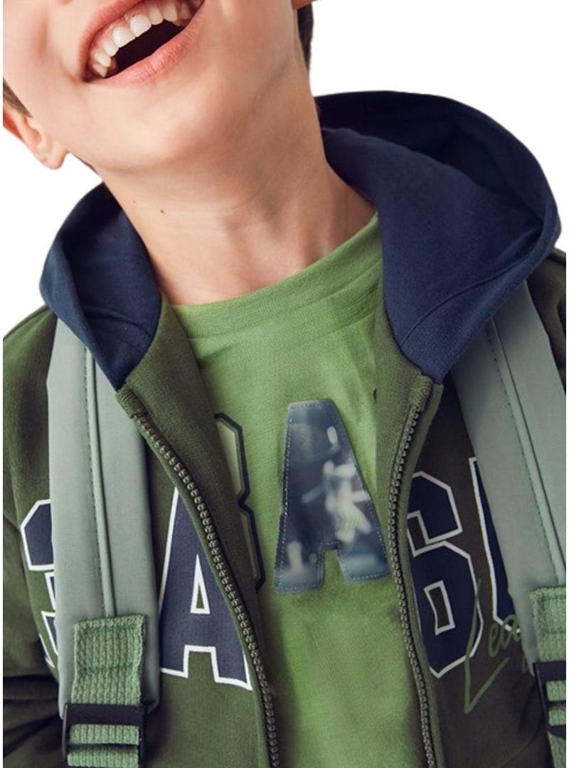 Fato de treino Mayoral. Três peças. Cor verde e azul marinho. Moletom e duas calças joggers. Tecido quente de velo grosso, perfeito para os meses frios. Moletom de manga comprida para menino. Modelo com capuz. Fecho central frontal com zíper. Barra e punhos de malha elástica para um ajuste melhor. Bolsos funcionais na parte da frente. Texto decorativo. Calças esportivas compridas. Cintura elástica com cordão. Joelheiras reforçadas por dentro para evitar desgaste na área e oferecer maior resistência e durabilidade. Bolsos nas laterais.