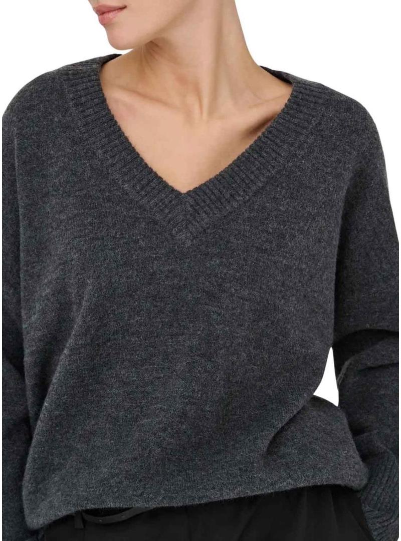 Camisola Only. Modelo Mari. Cor cinza escuro. Decote em V. Ajuste folgado. Extremidades caneladas. Estilo básico.