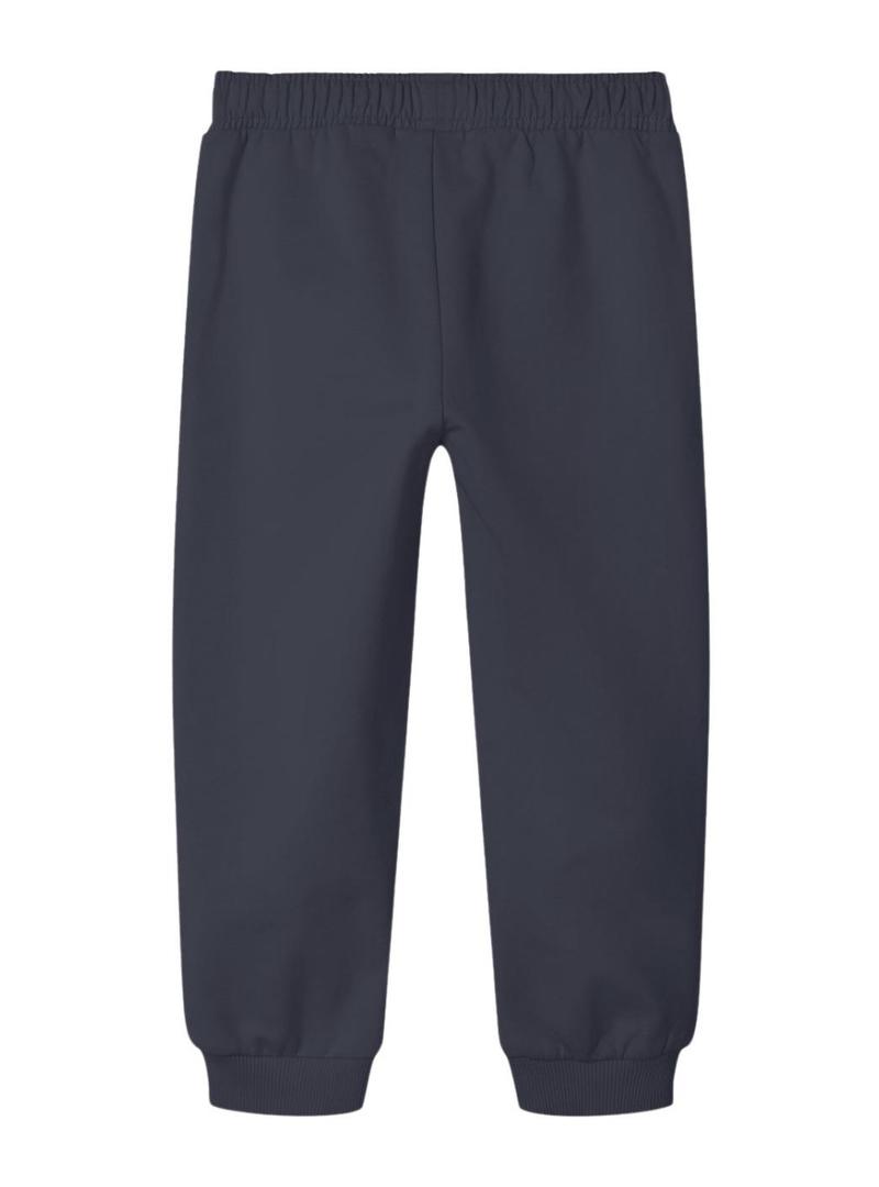 Calça Name It. Modelo Natasya. Cor azul escuro. Cintura ajustável. Cintura e barra elásticas. Bolsos laterais. Cintura com cordão. Design gráfico de patinete. Texto 'skater'.