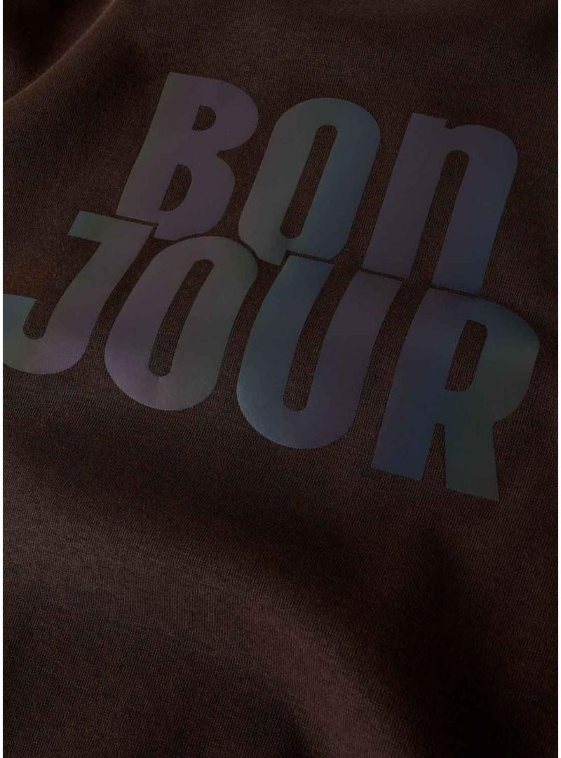 Moletom Name It. Modelo Randall. Cor marrom. Gola redonda. Extremidades caneladas. Ajuste regular. Mensagem Bonjour estampada no peito e nas costas.