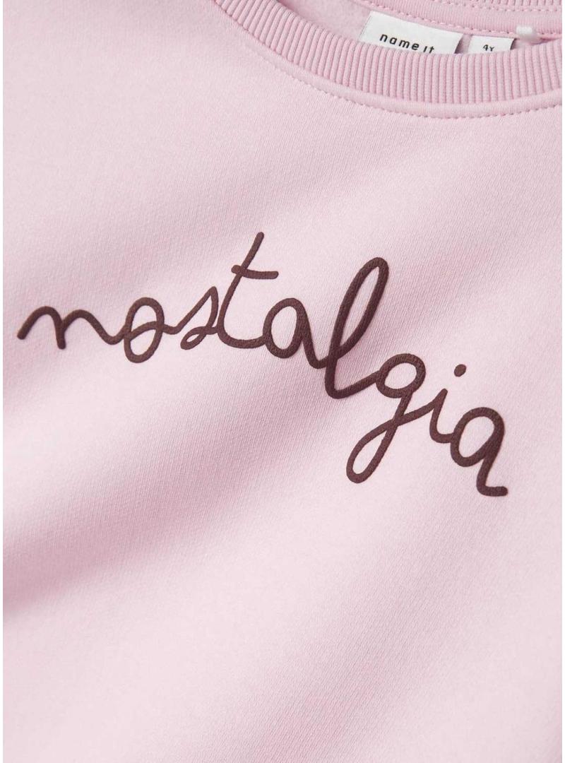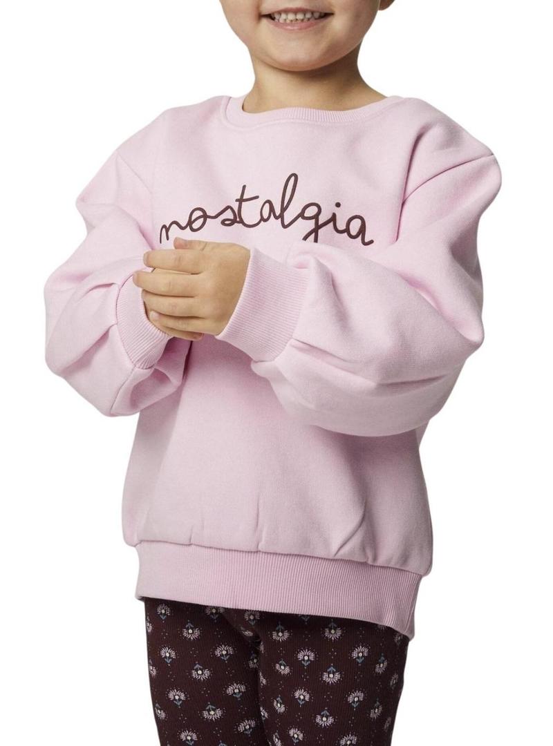 Moletom Name It. Modelo Fovi. Cor rosa. Gola redonda. Extremidades caneladas. Ajuste folgado. Manga comprida. Mensagem Nostalgia estampada no peito em cor granate.
