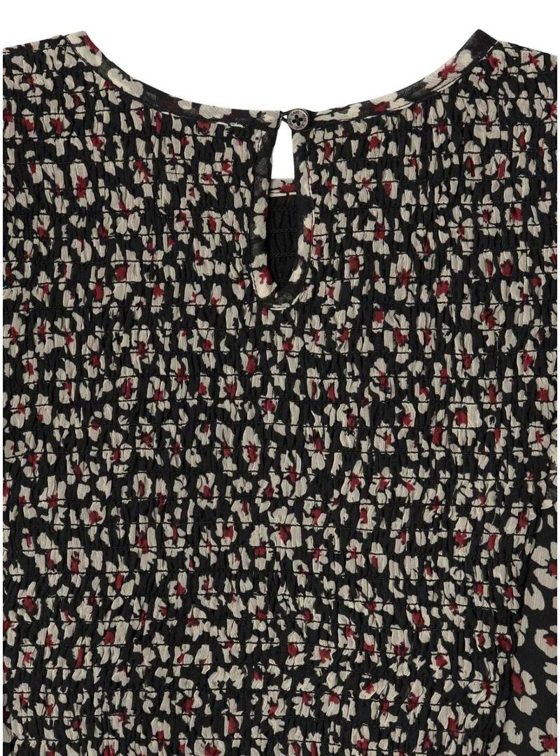 Blusa Pepe Jeans. Modelo Donabel. Cor preto. Gola redonda. Abertura traseira com botão. Tecido de gaze. Mangas translúcidas. Estampa de animal print. Babados nos ombros.