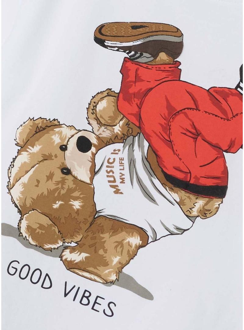 Camiseta Name It. Modelo Nathan. Manga comprida. Gola redonda. Corte regular. Estampa de um urso. Texto 'good vibes'.