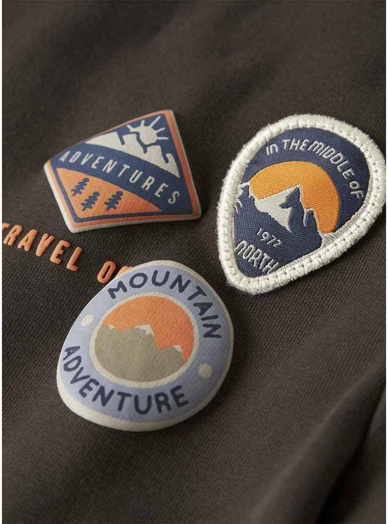 Moletom Name It. Modelo Mosman. Cor marrom. Gola redonda. Ajuste folgado. Extremidades caneladas. Patches estampados na parte da frente. Mensagem Adventure estampada nas costas.