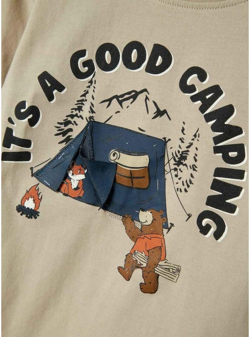 Camiseta Name It. Modelo Molen. Cor bege. Gola redonda. Manga comprida. Ajuste regular. Ilustração de acampamento estampada na frente.